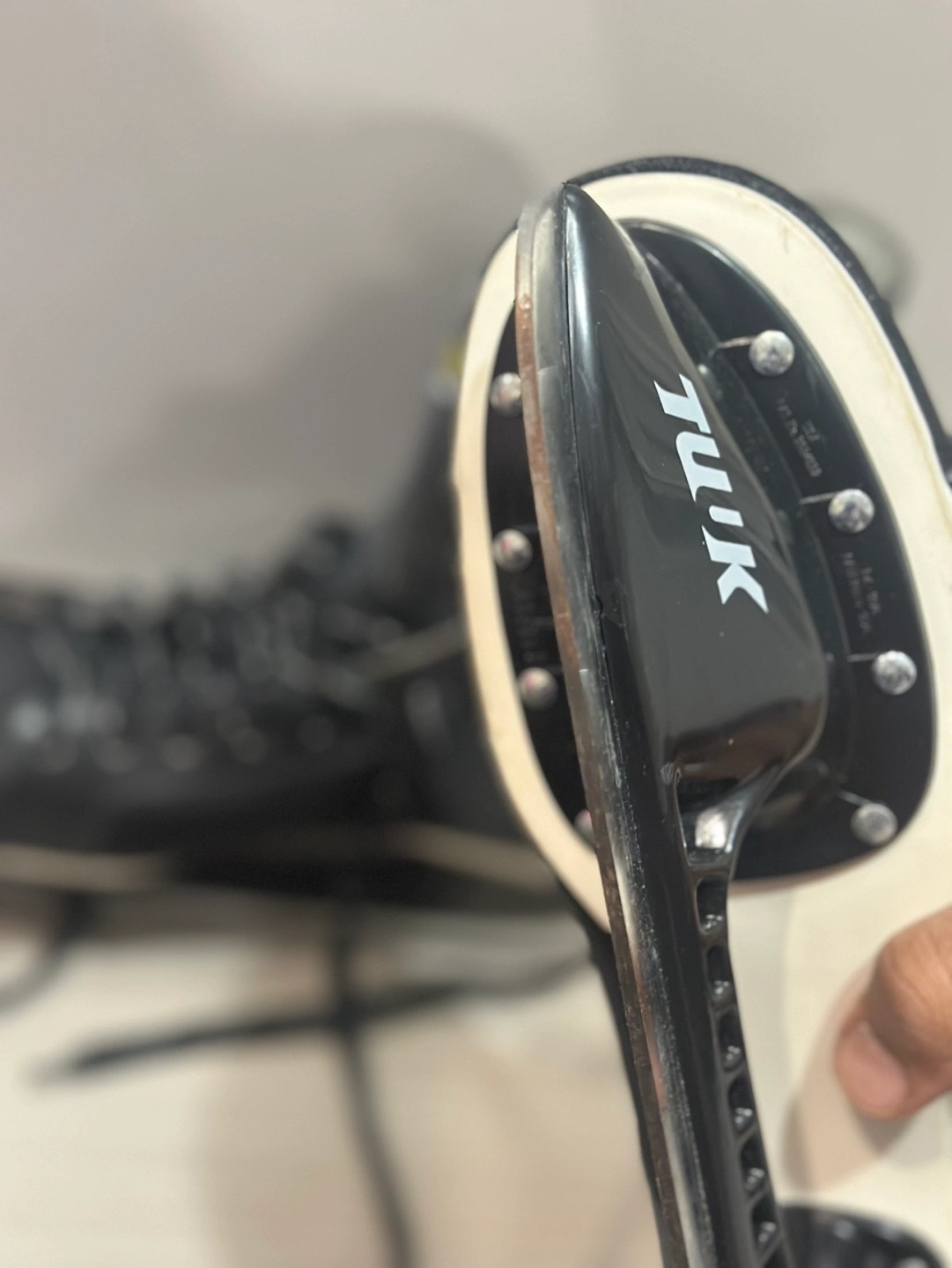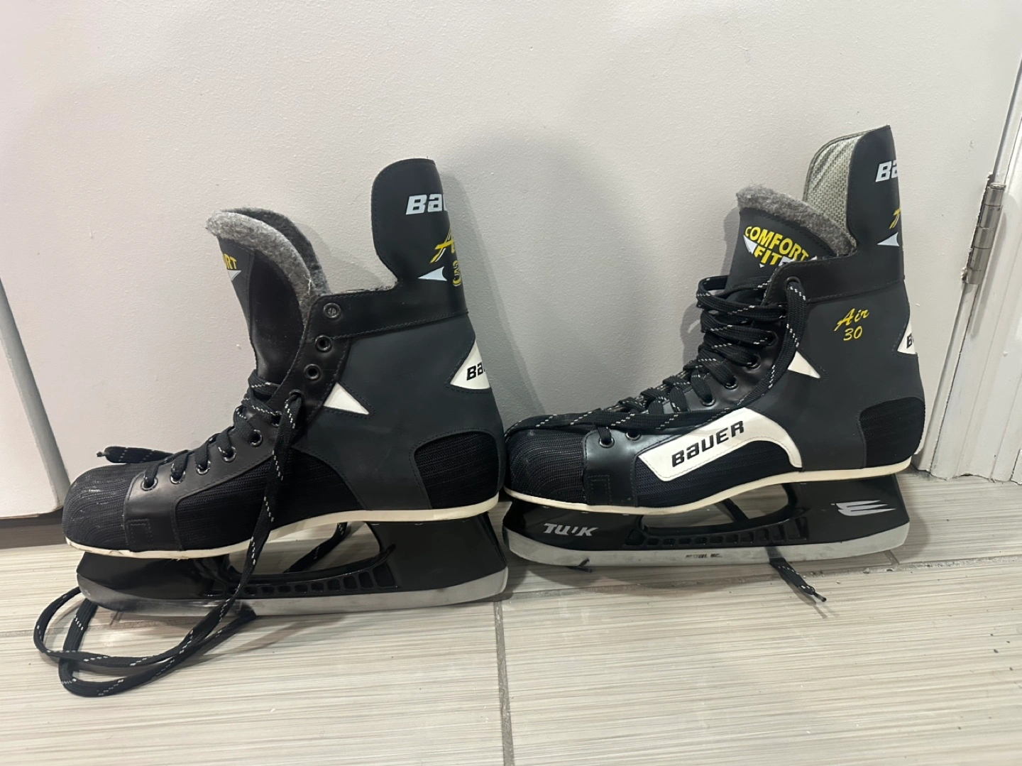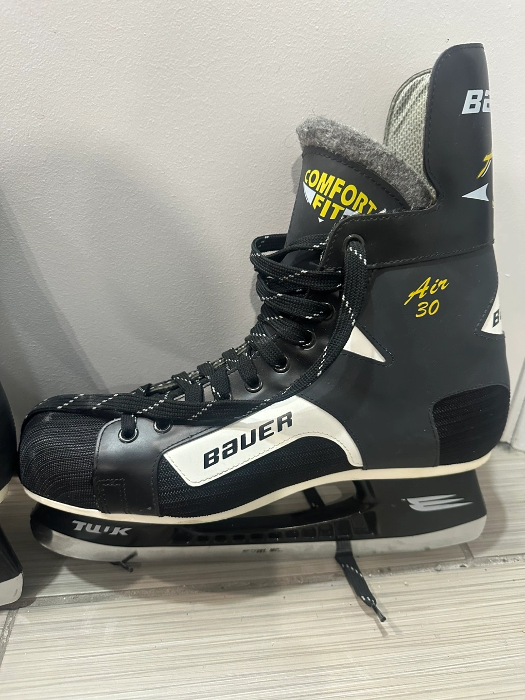 Bauer Air 30 ice skates. Size 10. Black with white accents. Tuuk blades. Great condition. Comfortable fit. No rust at all. Barely used. Still has lots of winter yet to enjoy these.