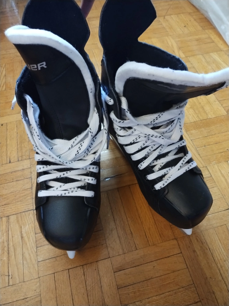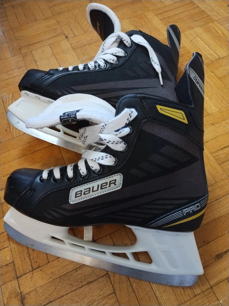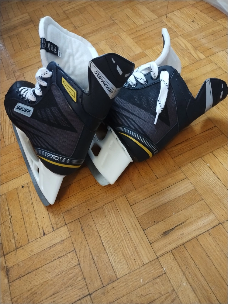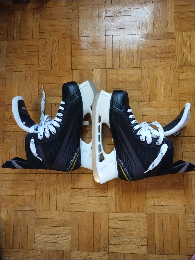 Selling a pair of Bauer hockey skates in great condition! They're black with white laces and soles, and have the Supreme logo on the back. Perfect for hitting the ice! Almost new