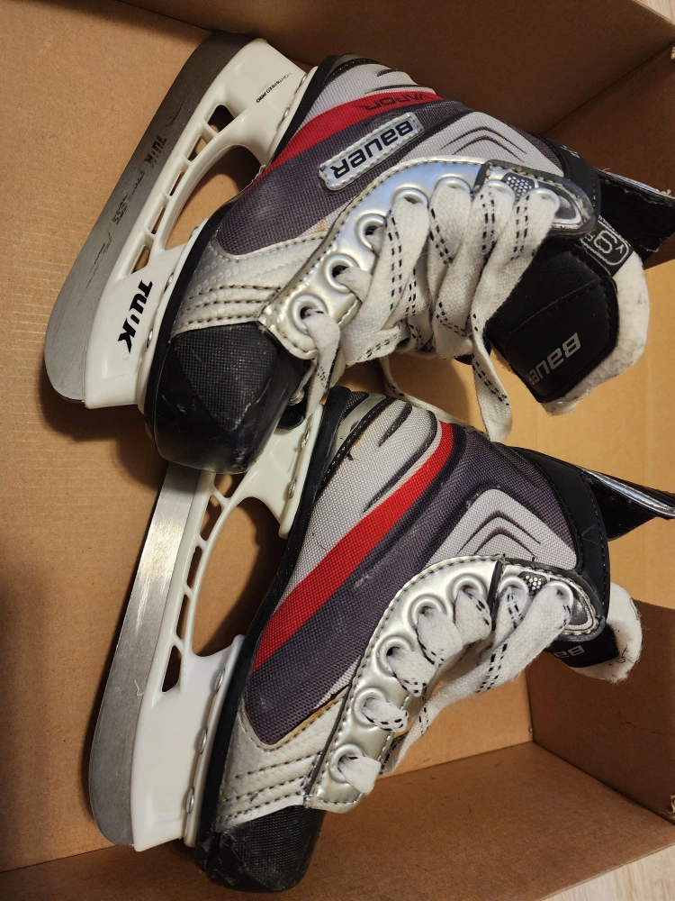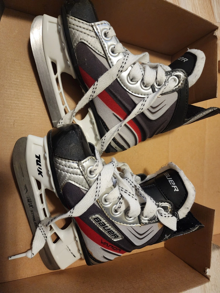 48Used youth size hockey skates. Black, grey and red colour scheme. Size US Y10 / UK Y9.5 / EUR 27 Pick up only