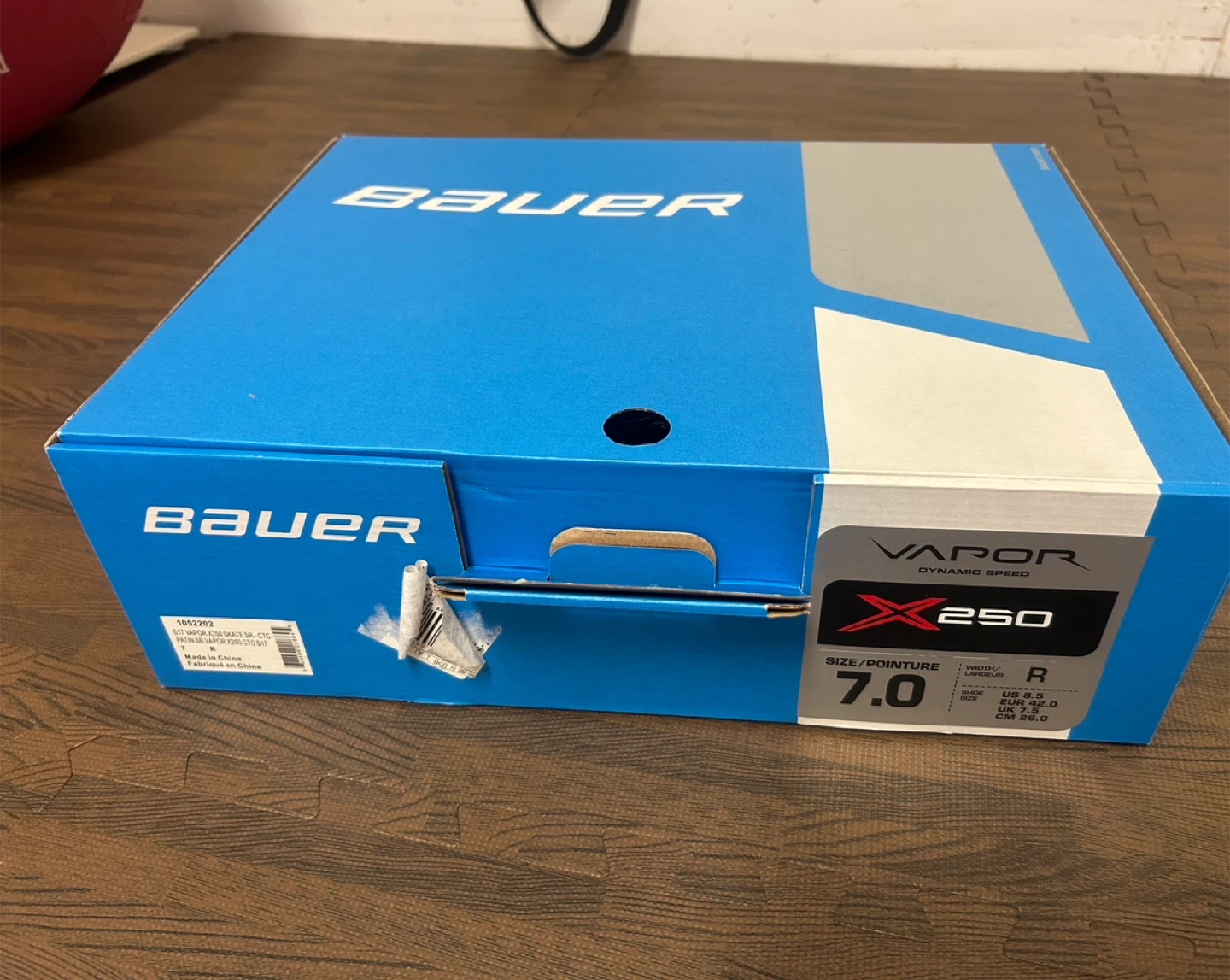 10Selling a pair of Bauer Vapor X250 ice skates in size 7.0! These skates are in excellent condition and come with the original box. The skates are black with white laces and red accents. We only got them Sharpened once.