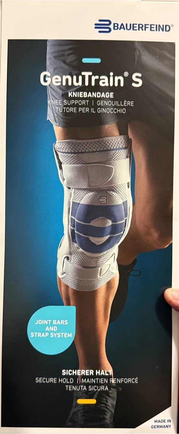 60Selling a Bauerfeind GenuTrain S knee support! It features joint bars and a strap system for secure hold. This knee support provides additional support for the knee joint and includes a massage pad with gestrickkompression for reduction of pain in the knee joint. 100% new Knee Support - GenuTrain GenuTrain S active support with lateral joint splints supports the knee joint for indications of slight instability, arthritis or osteoarthritis of the knee. Medical Ccl 1 (20-30 mmHg) Adjustable hinges to select flexion and extension angles Rigid plastic hinges with strap system Stabilizes the knee joint and activates the muscles Breathable Train Active Knit for high wearing comfort Anatomically contoured bars for secure support Guides and Massages: The integral elastic padded ring round the kneecap cannot slip. It helps to position the support correctly and adapts itself to the angle of the knee joint during every movement. This produces a massage effect which activates the surrounding muscular tissue and stimulates circulation. The GenuTrain S, with its medically effective interaction of compression and massage, accelerates the reabsorption of edema and effusions. Muscular control is improved and the knee receives more active support. Bars for added protection: In the GenuTrain S (S for splints), lateral joint splints guide the knee's movements. The bars can be heated and reshaped and can therefore be adjusted to the anatomy of each individual. The joint muscles are stabilized further by the elastic Train Active Knit with its integral pad. Materials: Polyamide (PA), Styrene-ethylene/butylene-styrene block copolymer (TPS-SEBS), Elastodiene (ED), Polyurethane (PUR), Spandex (EL), Viscose (CV), Polyester (PES), Polyoxymethylene (POM), Cotton (CO)