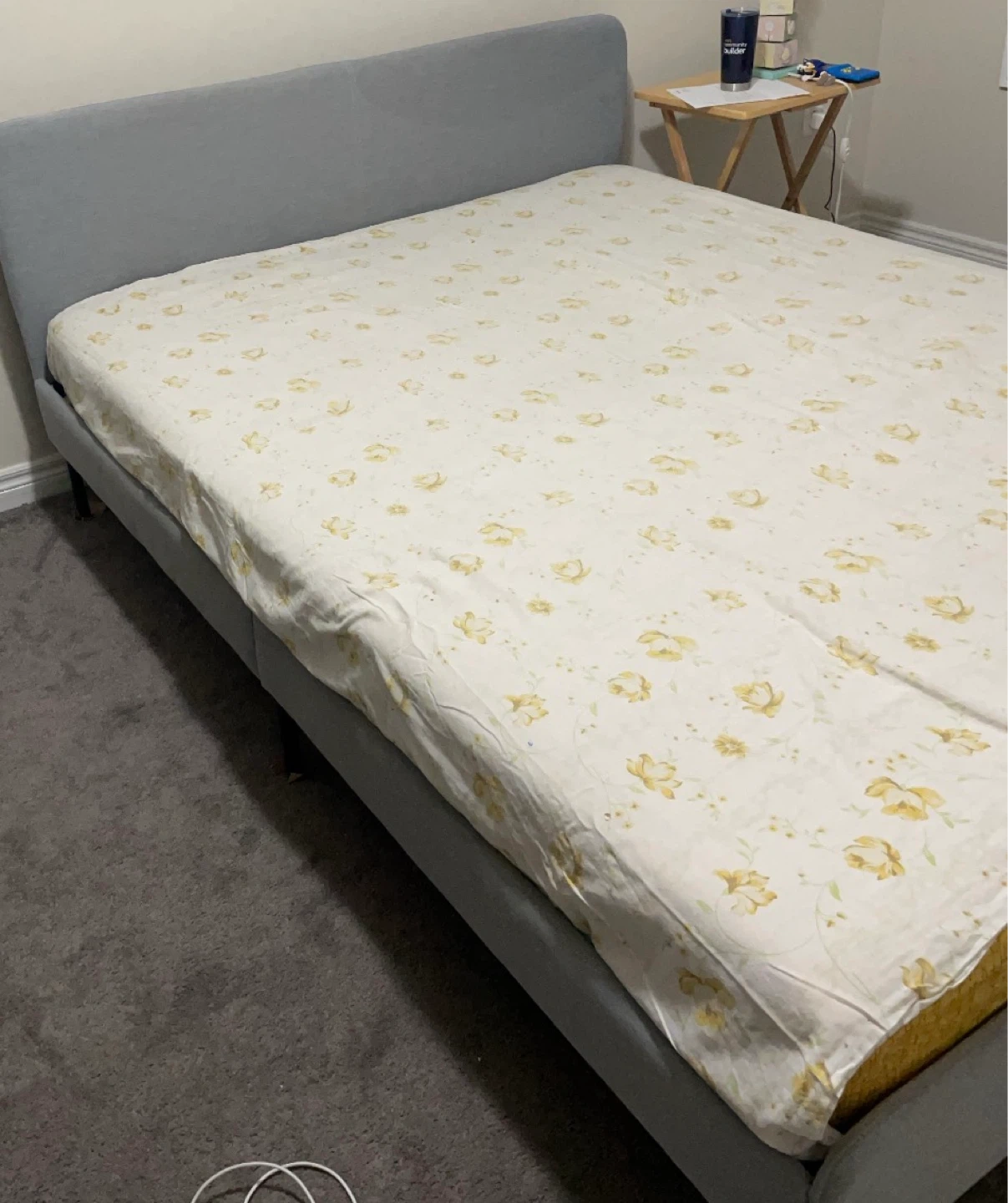 Grey upholstered bed frame with a simple design. The headboard is a solid piece with a slight curve. Bedding is a white sheet with a yellow floral pattern.