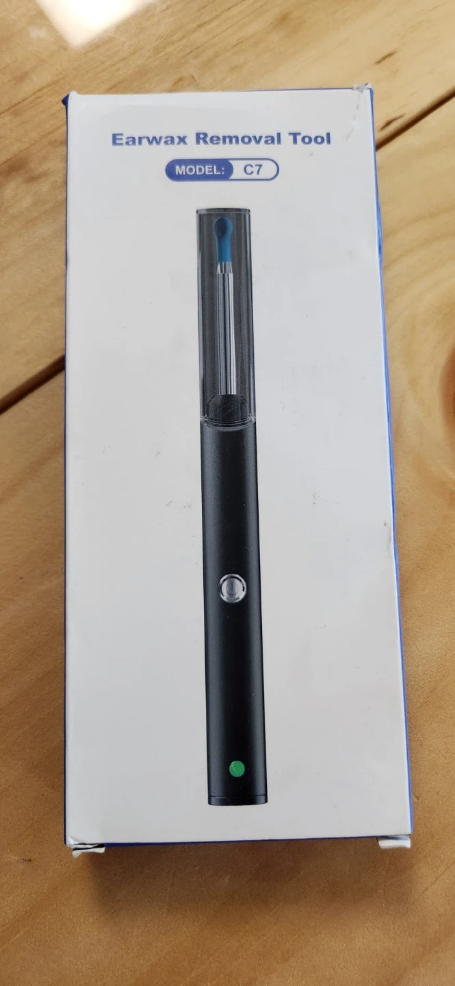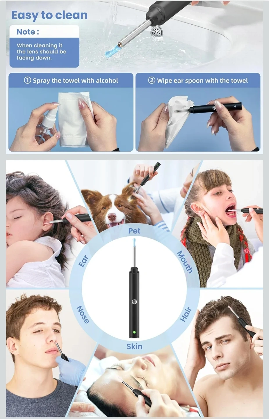 This black earwax removal tool features a high-precision lens with large light input for clear visibility. It's wireless and comes with multiple ear picks and a USB charging cable. This tool is useful for cleaning ears, nose, skin, and even for checking pets or hair.