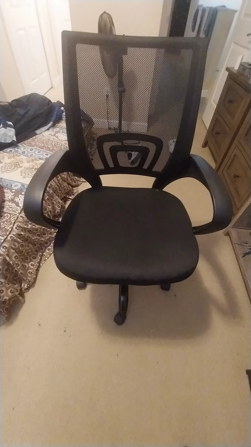 This is a black mesh office chair. It features a comfortable padded seat and adjustable height. The mesh back allows for good airflow.