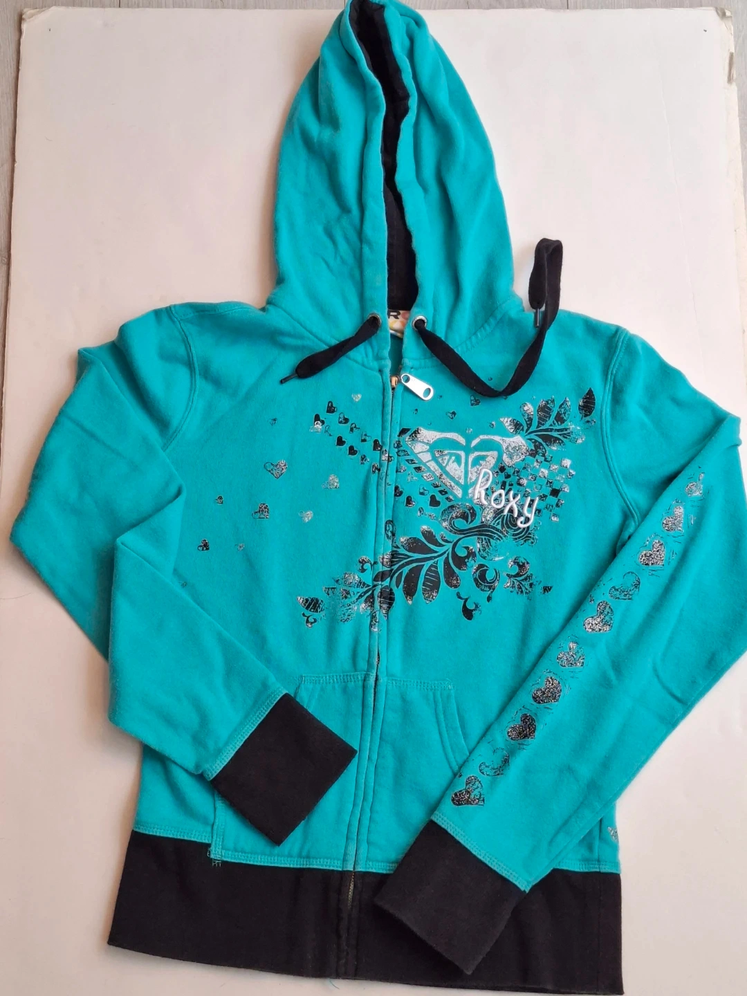 Teal Roxy zip-up hoodie has black contrast cuffs and hem. Cotton blend fabric features silver and black heart graphics on front, back, and left sleeve. Top has drawstring hood and two front pockets. It's a great layering piece for casual wear!