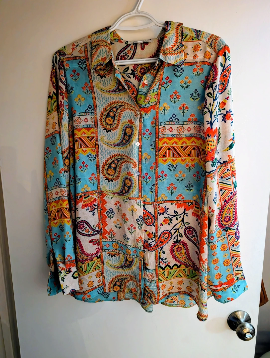 This long-sleeve shirt boasts a vibrant patchwork of paisley and floral prints. It features a classic collar and button-front closure. The fabric appears to be a lightweight, silky material.