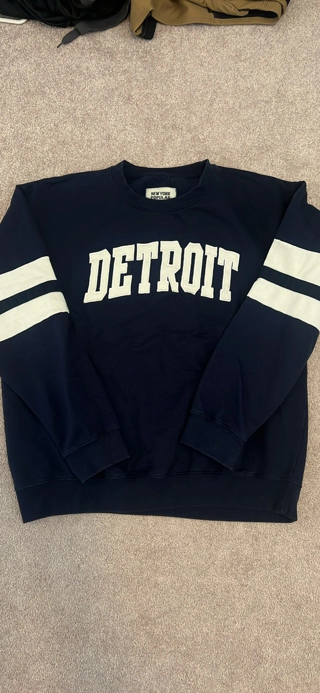 Get ready to show your Detroit pride with this Popular Detroit Sweatshirt in XL. This used sweatshirt features a classic design with 'DETROIT' emblazoned across the chest, complete with sporty stripes on the sleeves. It's made from a comfortable 60% cotton, 40% polyester blend, perfect for those casual days or cozy nights in. Specifications: Brand: New York Popular, Size: XL, Material: 60% Cotton, 40% Polyester, Design: 'DETROIT' lettering with striped sleeves. If you're seeing this ad, the sweatshirt is still available! Condition: Used - Good. Payment: Cash accepted.