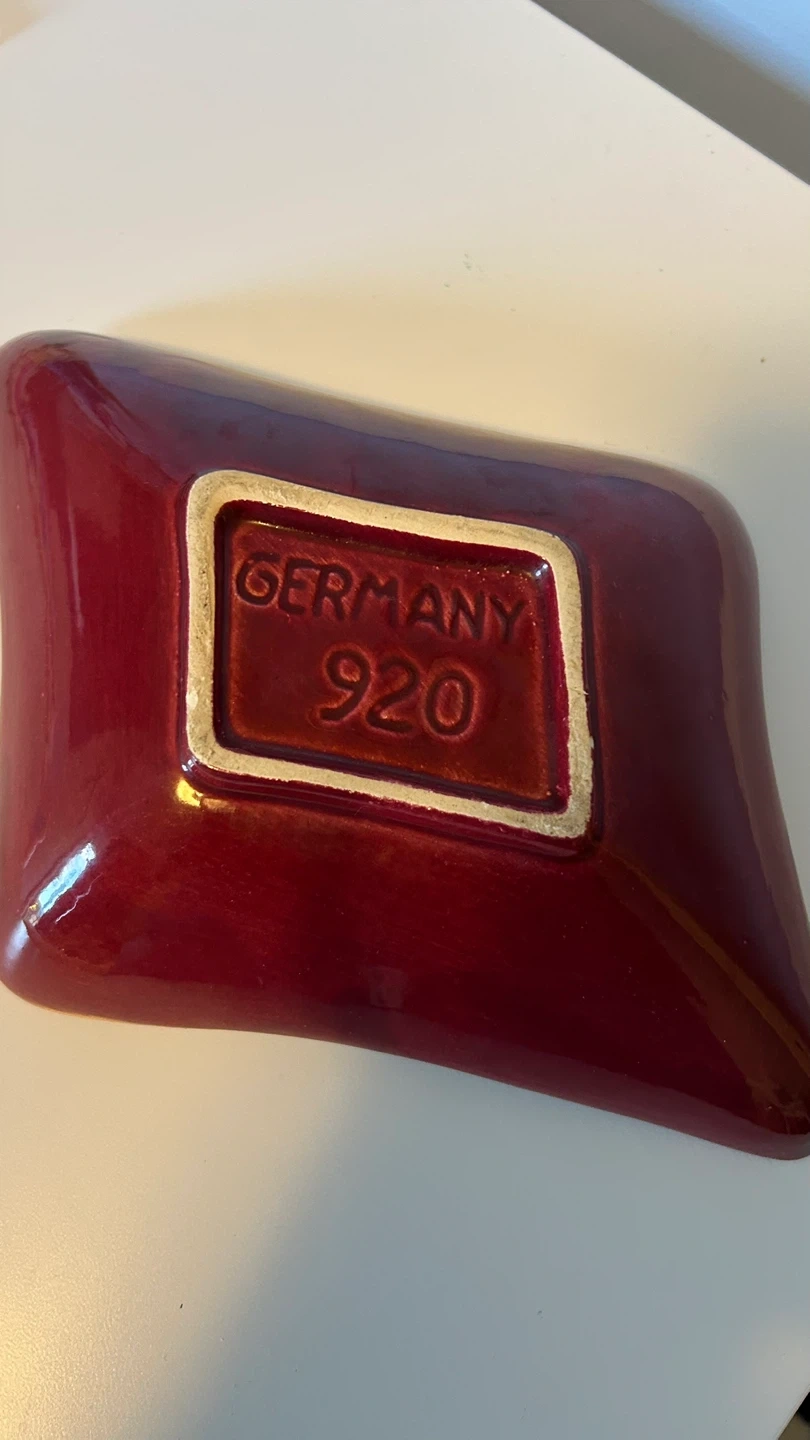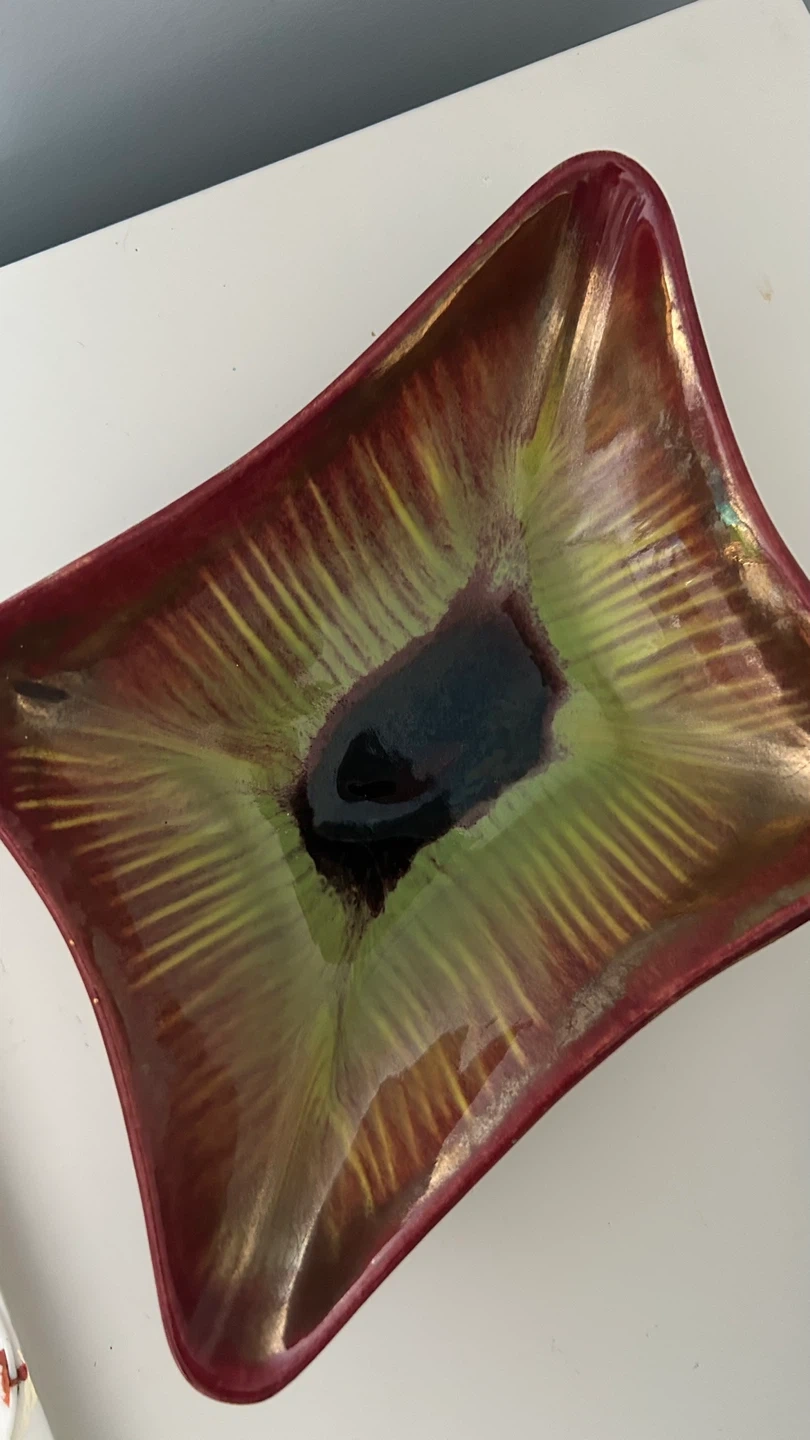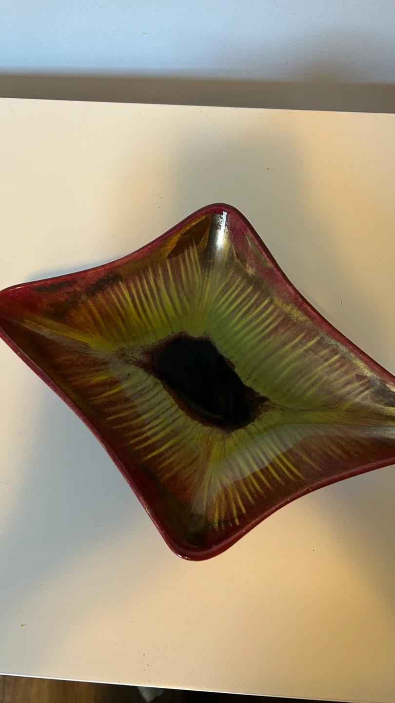 West Germany Bay Keramik Decorative Dish. Drip glaze with lovely Starburst. Bay Keramik was known for vibrant colours in the design process. The dish is in great shape. No cracks, chips or crazing. Stamped Germany 920. 10” x 8” A great Vintage piece by Bay Keramik