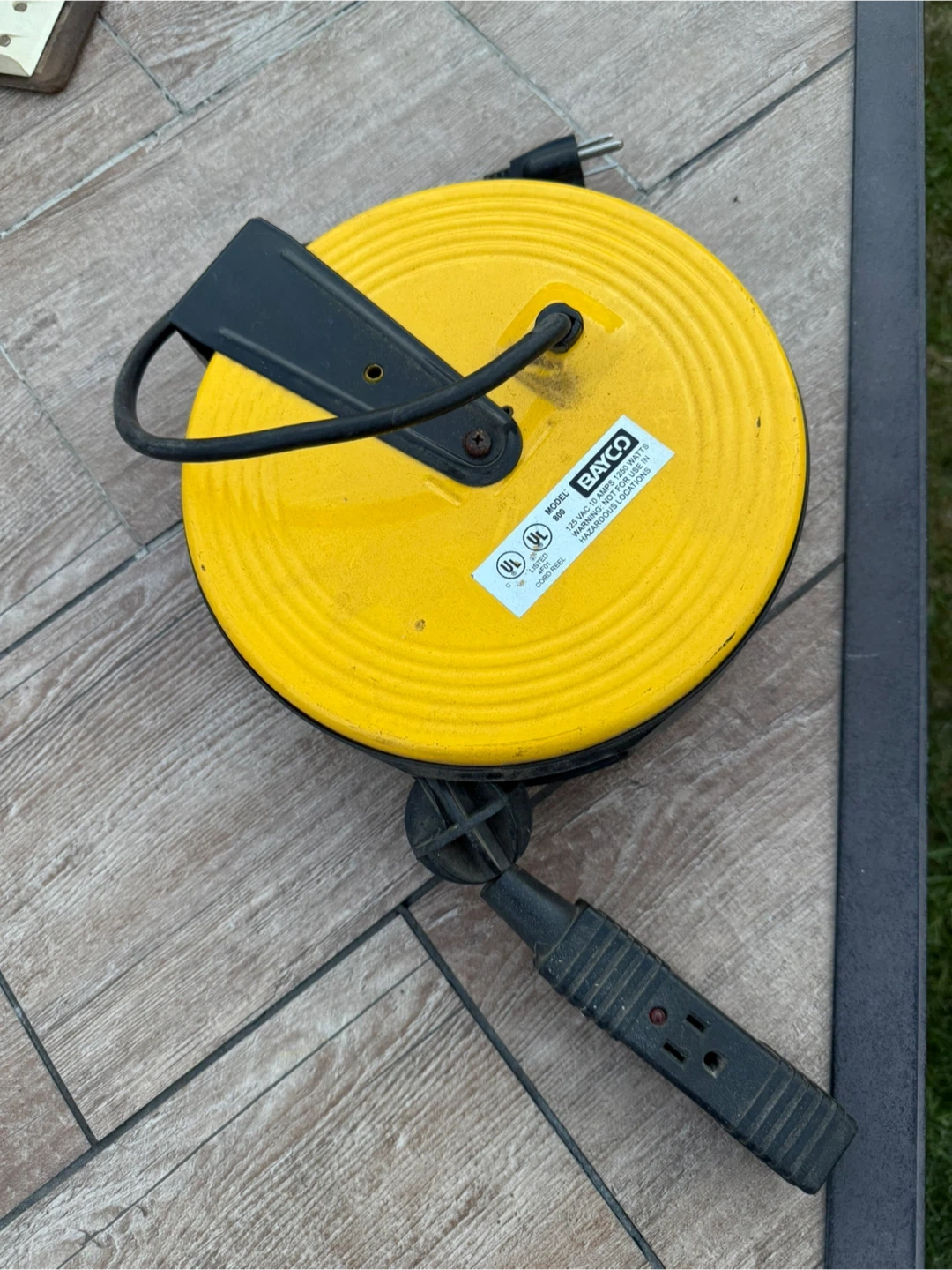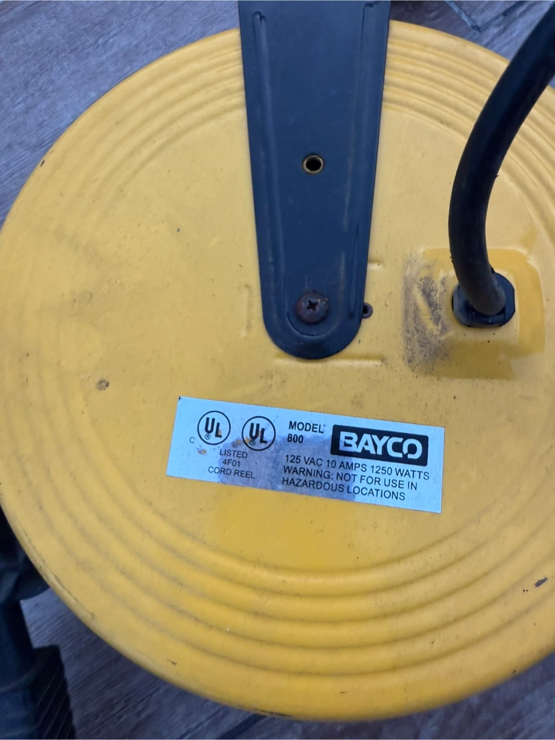 73Selling a BAYCO 800 cord reel. It is yellow and black. It is listed for cord reel and is 125 VAC 10 AMPS 1250 WATTS. Warning: Not for use in hazardous locations