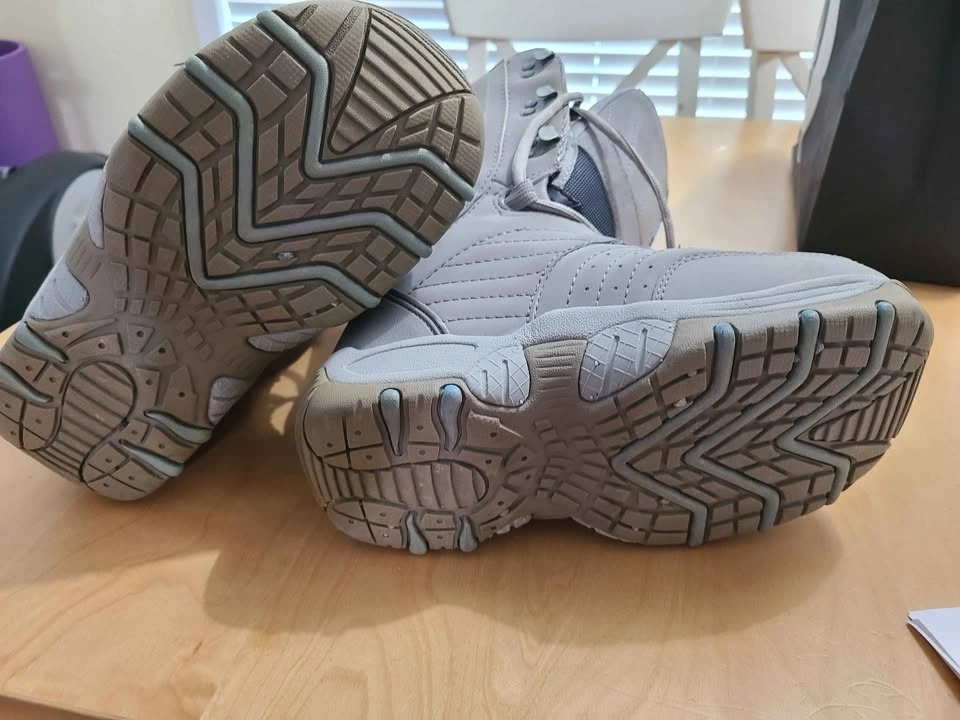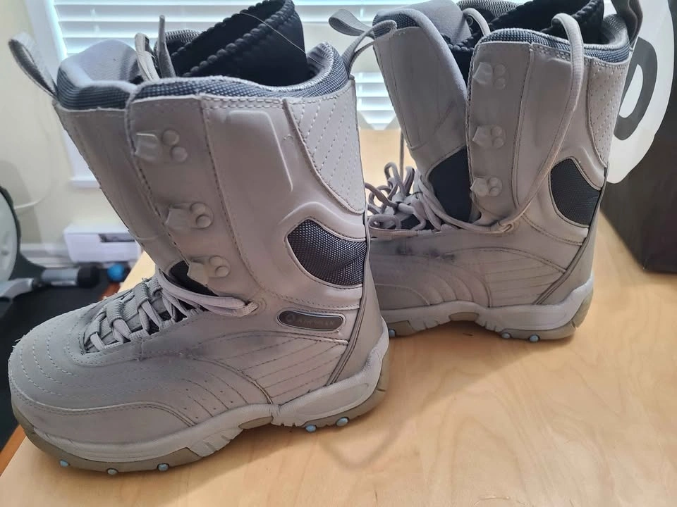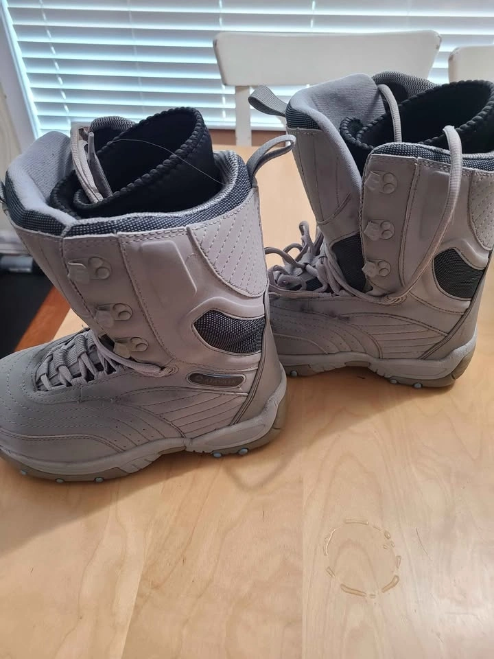 Great condition gray snow boots, size 6. Made with man-made materials, they have laces and a black lining. The soles have some wear but are still in good shape.