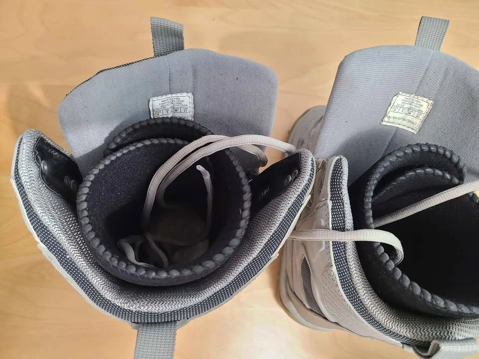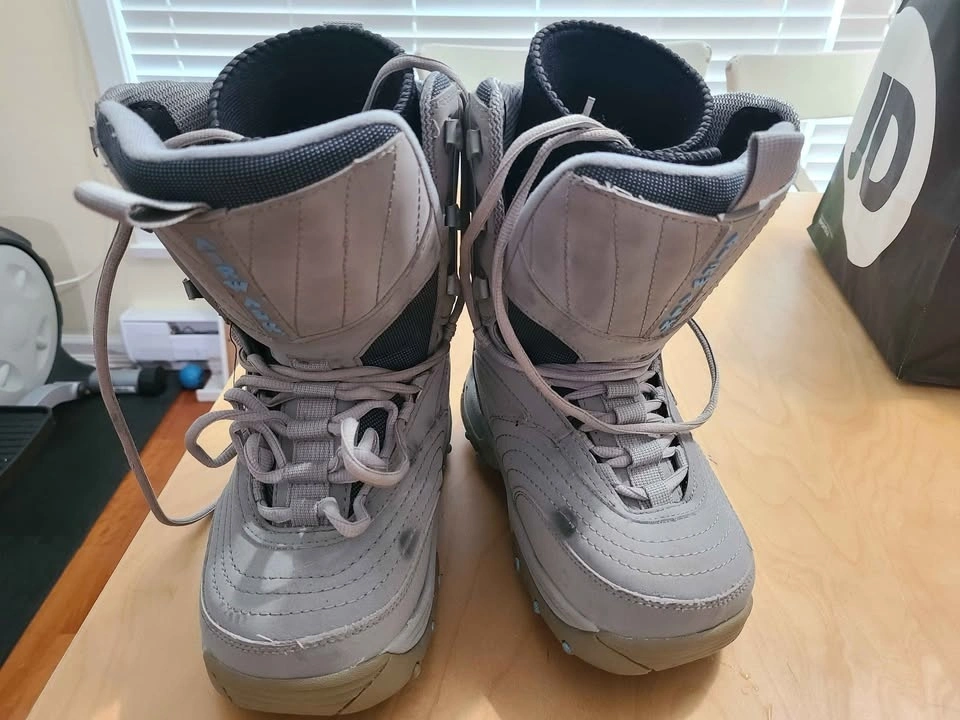Great condition gray snow boots, size 6. Made with man-made materials, they have laces and a black lining. The soles have some wear but are still in good shape.