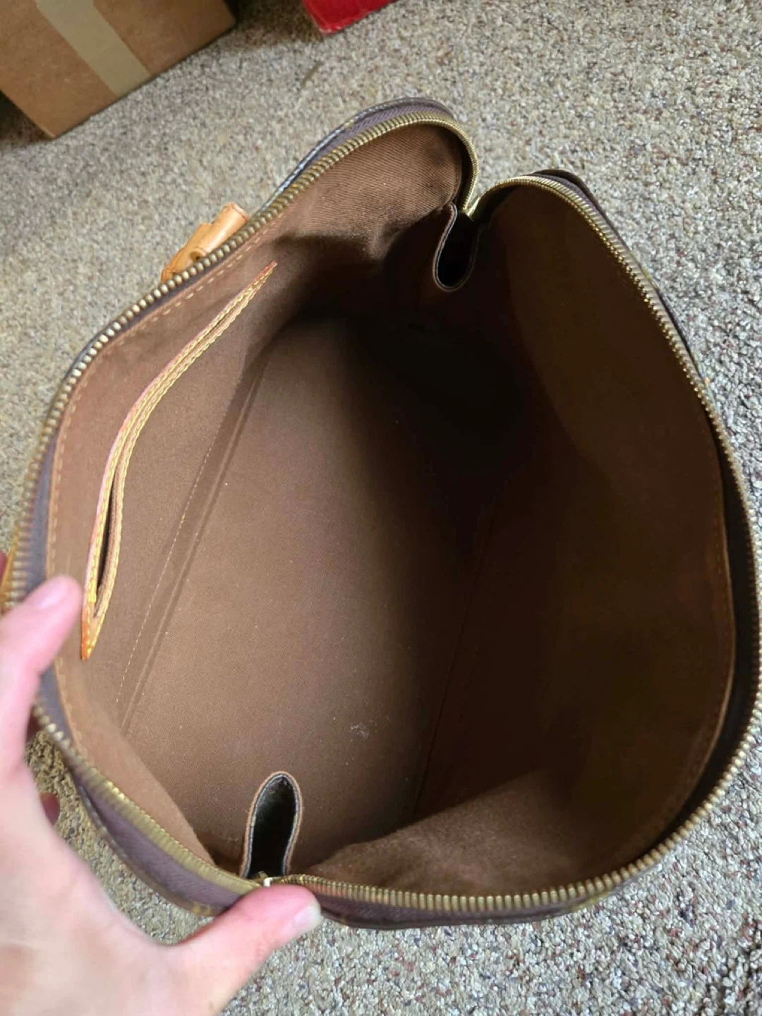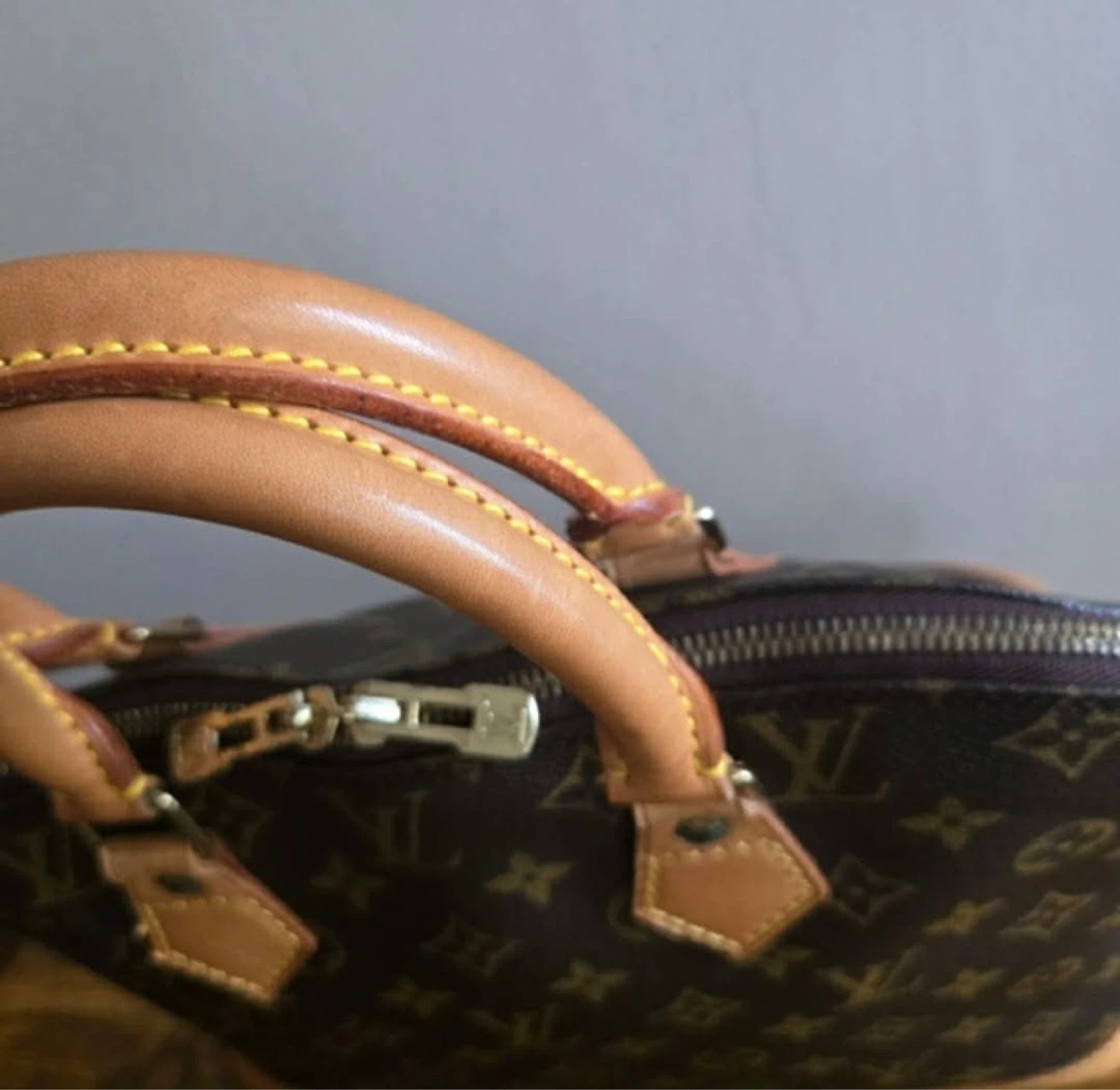 Classic Louis Vuitton Alma handbag in signature monogram canvas. This bag features rolled leather handles and a zip-around closure. Interior includes a small pocket. Date code VI0943.