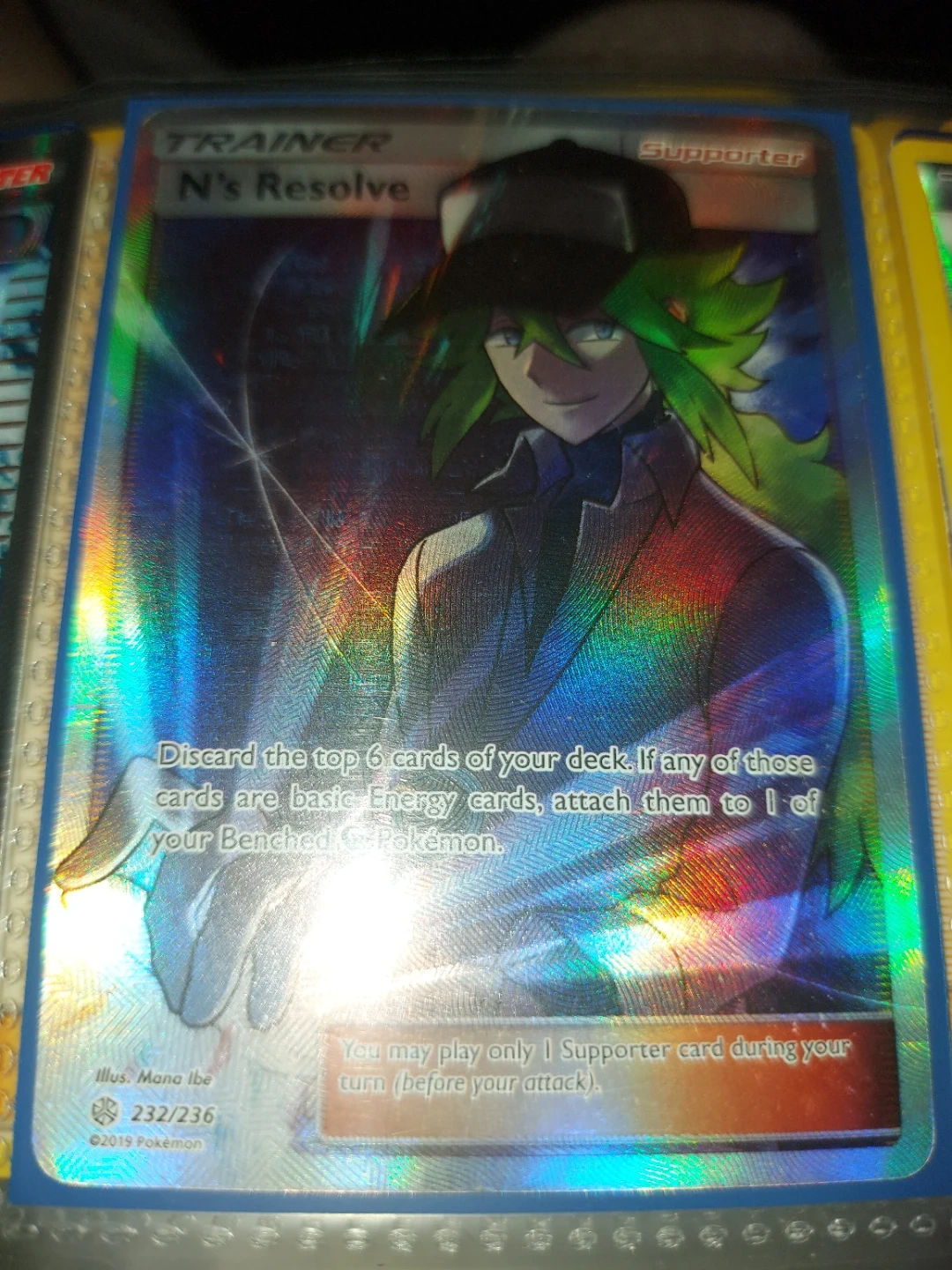 This is a Pokemon N's Resolve Trainer card, featuring full art. It's part of the 232/236 set from 2019. The card has a holographic finish and is in good condition.