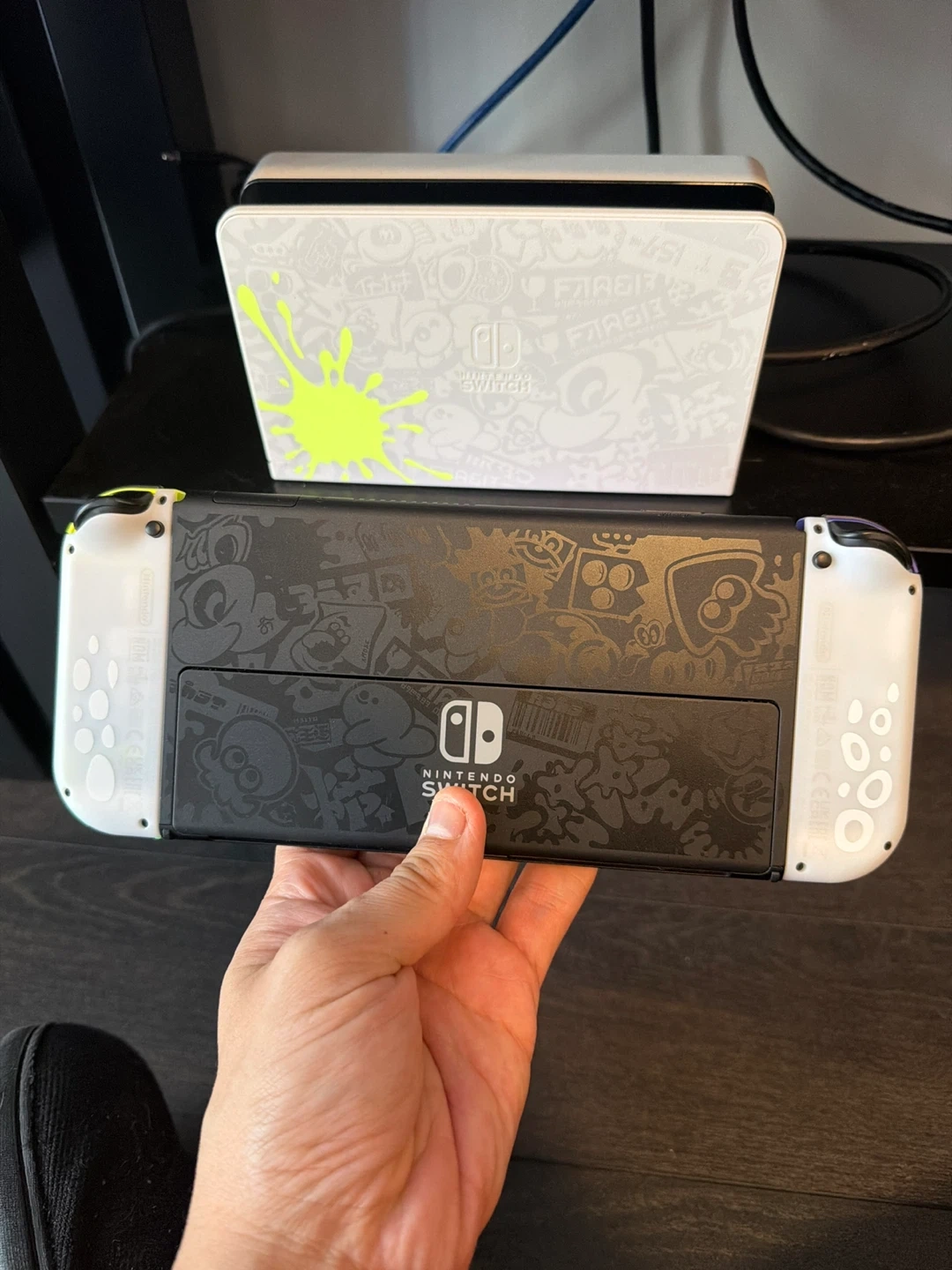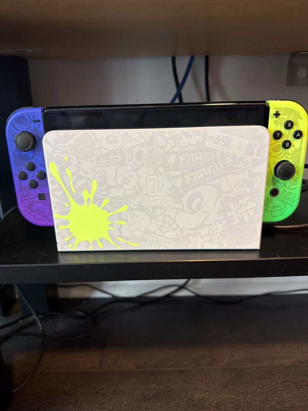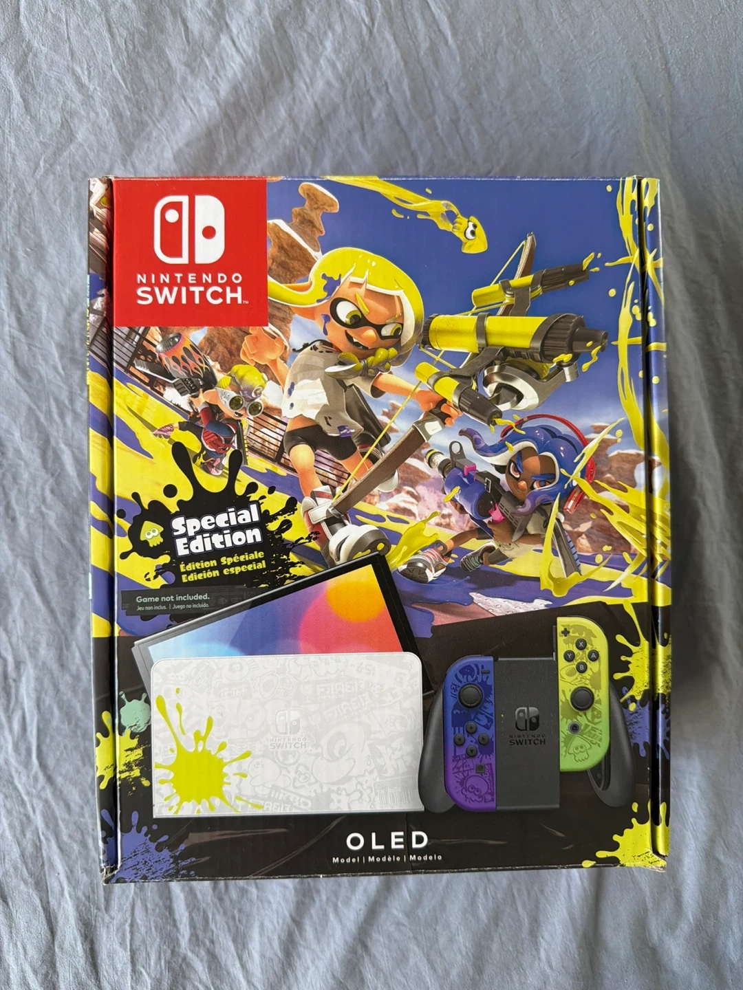 Special edition Nintendo Switch OLED model console. It features a unique Splatoon 3 design with vibrant colours. Includes Joy-Con controllers, HDMI cable and dock.