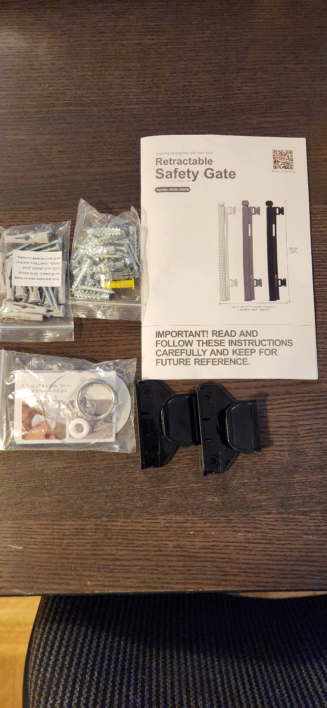 Retractable safety gate. Includes all hardware and instructions. Easy installation. Perfect for doorways and hallways.
