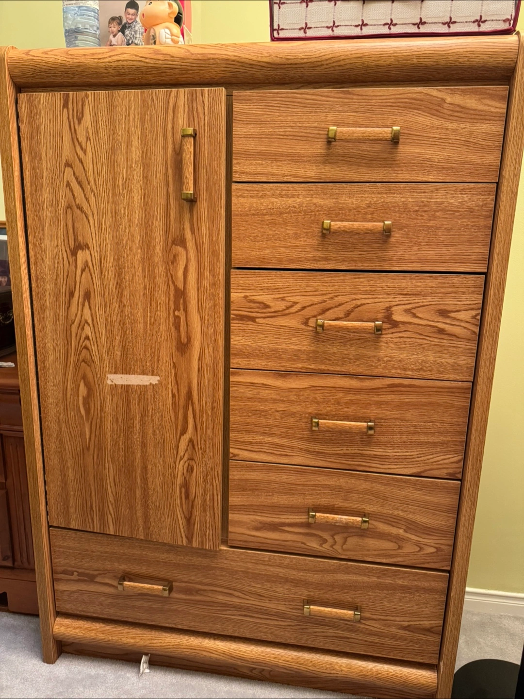 Selling a stylish and functional vintage mid-century modern dresser with a unique combination of drawers and a cabinet. This solid piece is perfect for anyone who loves retro or minimalist furniture with a warm, wood-grain finish.
