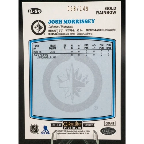 Josh Morrissey 2016-2017 O-Pee-Chee Platinum Retro Gold Rainbow card, #68/149, #R-89. The card is shipped in a penny sleeve and top-loader. Feel free to message if you have any questions!