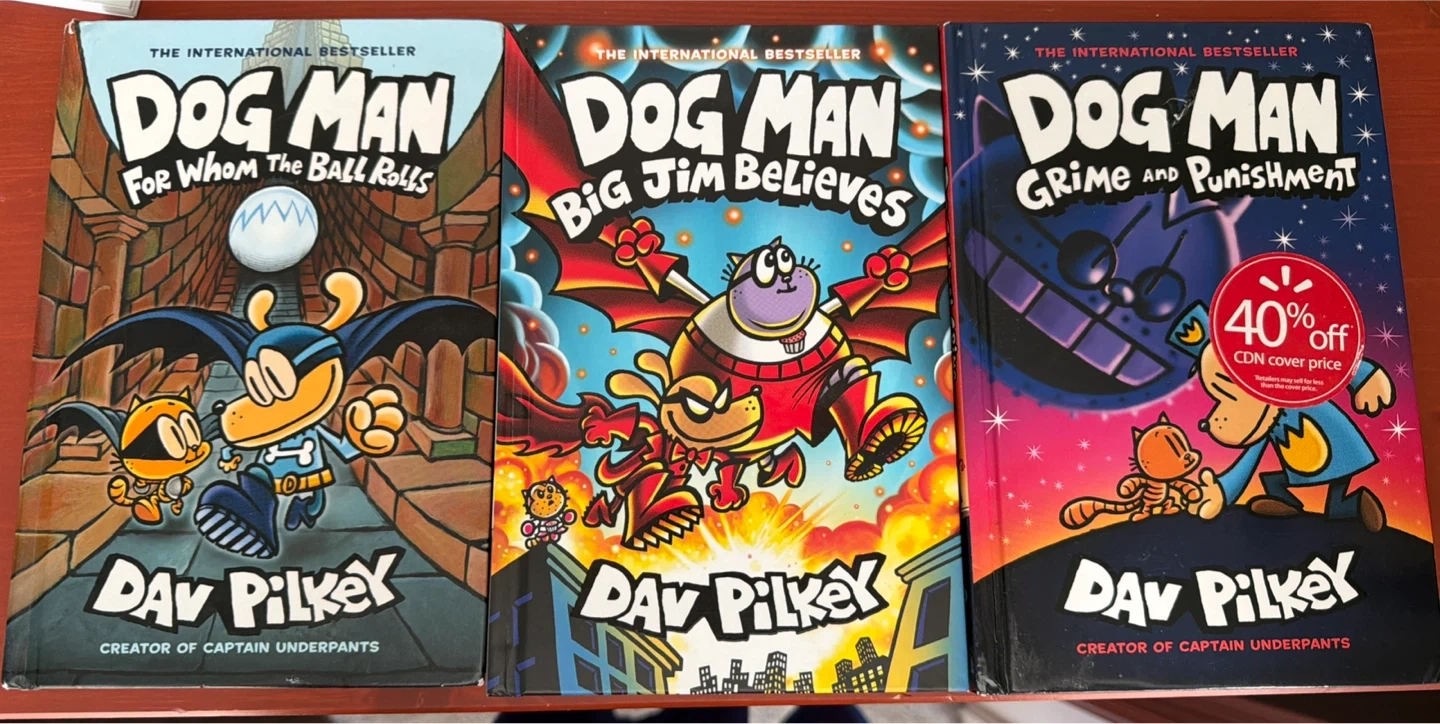 Set of three Dog Man books by Dav Pilkey: For Whom the Ball Rolls, Big Jim Believes, and Grime and Punishment. These are international bestsellers from the creator of Captain Underpants. Perfect for young readers who love adventure and humour!