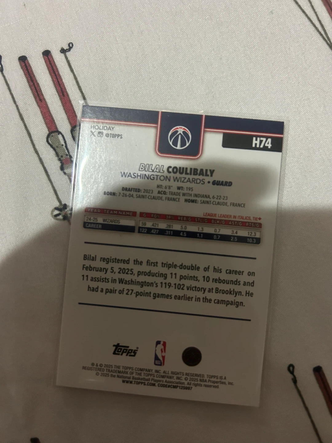 This is a Topps H74 basketball card featuring Bilal Coulibaly of the Washington Wizards. It includes his player stats and career highlights. A great card for any basketball collector!