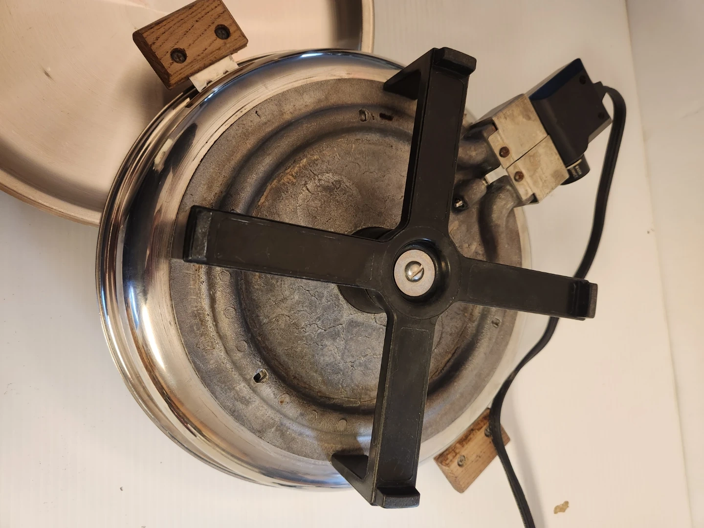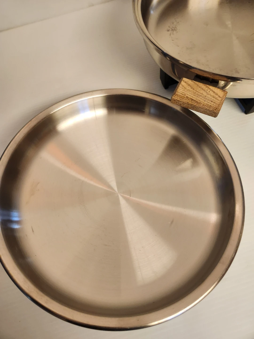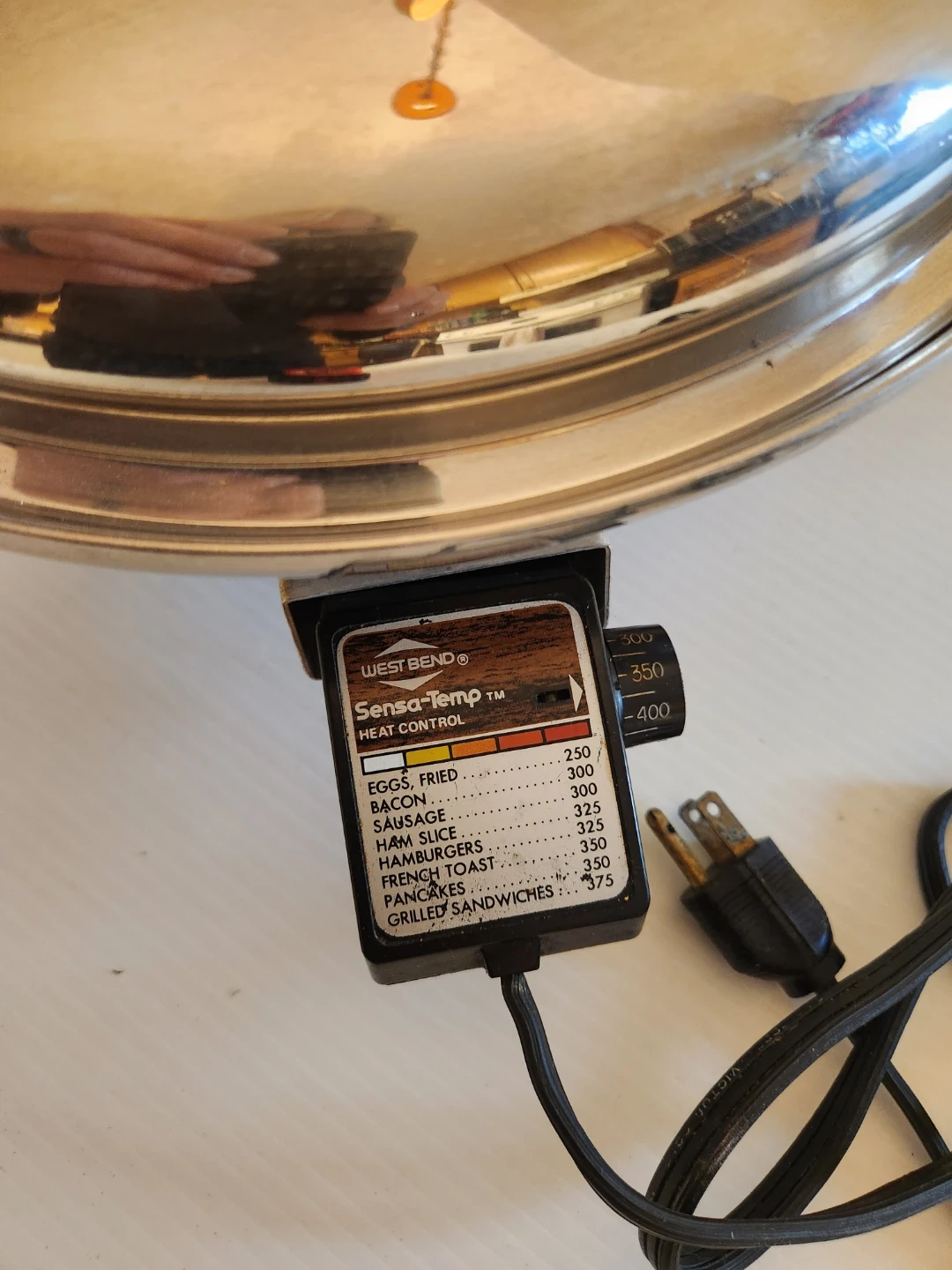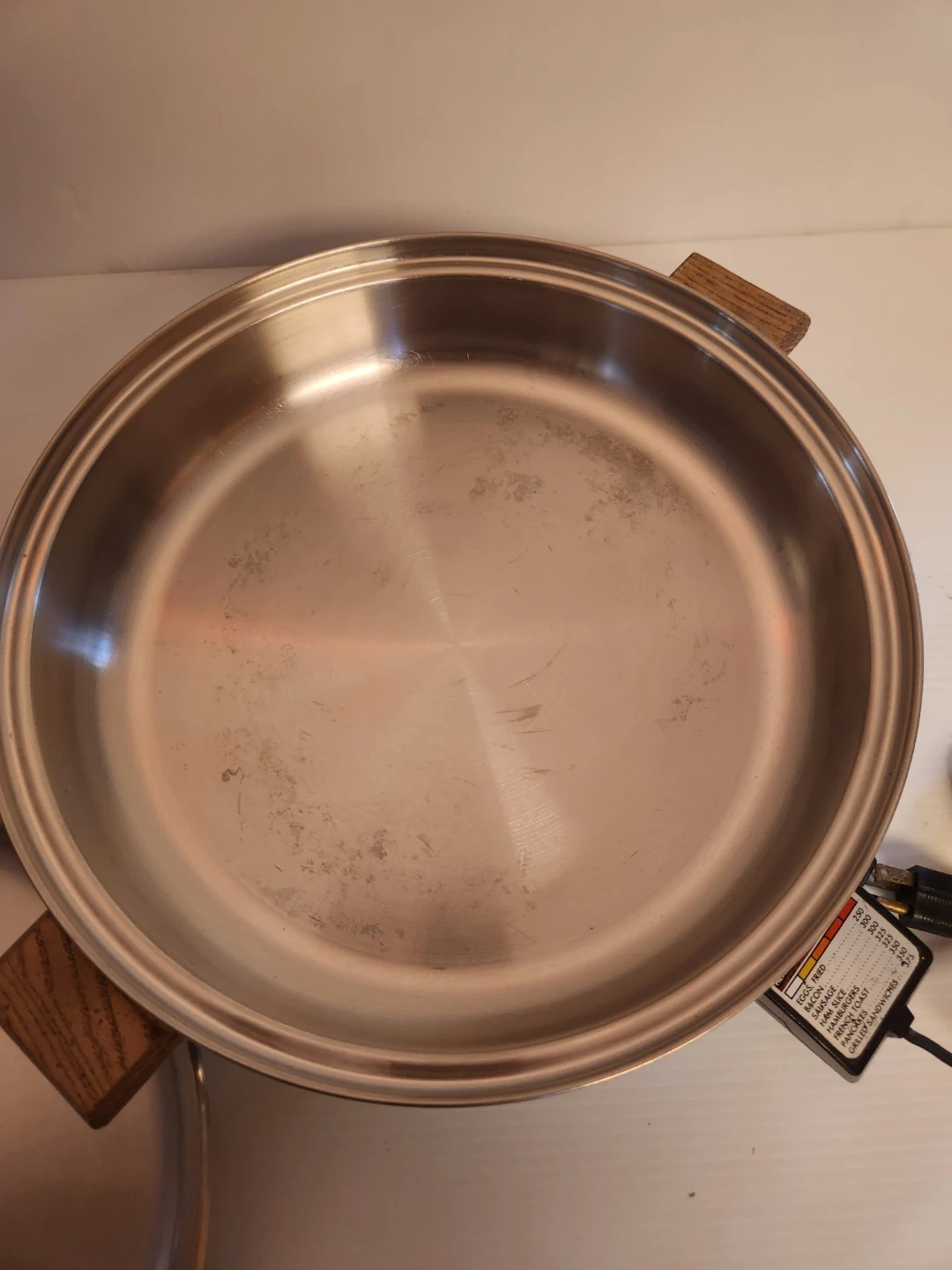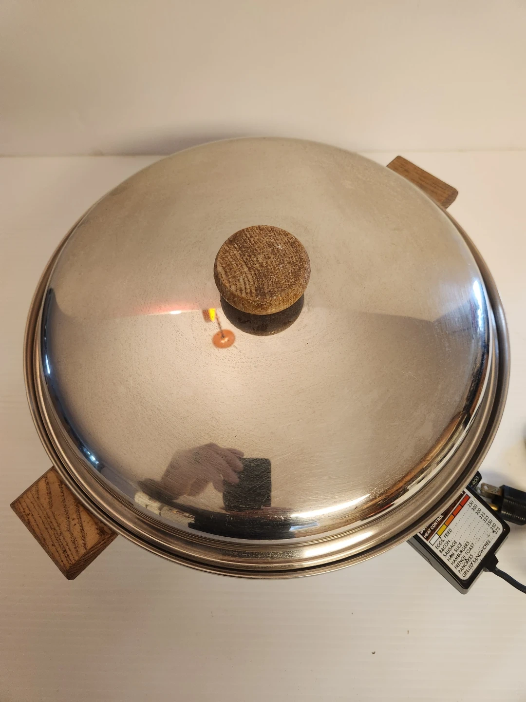 West Bend electric skillet 12 inch with a stainless steel body and wooden handles. It comes with a matching lid. The temperature control unit is included.