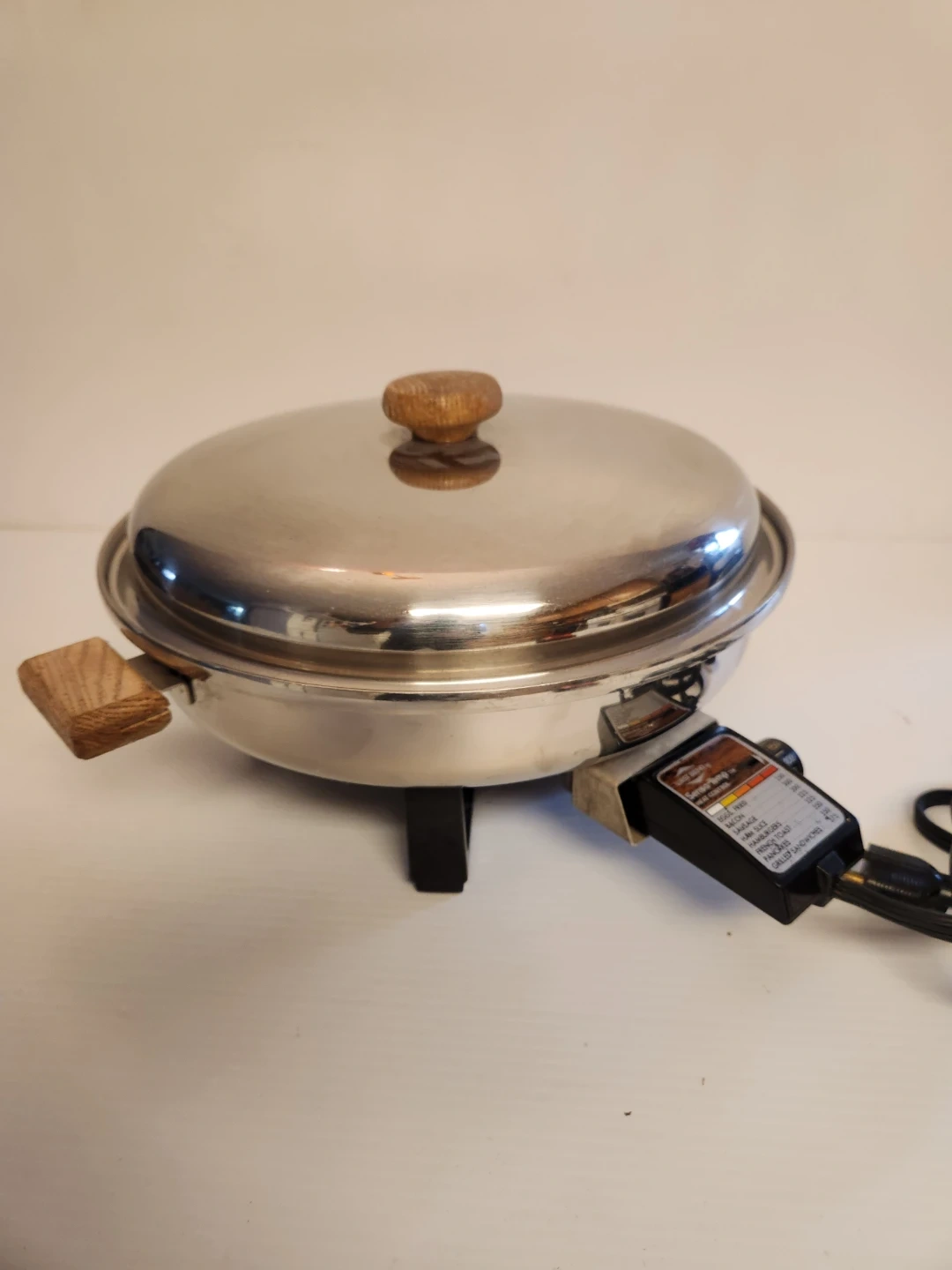 West Bend electric skillet 12 inch with a stainless steel body and wooden handles. It comes with a matching lid. The temperature control unit is included.