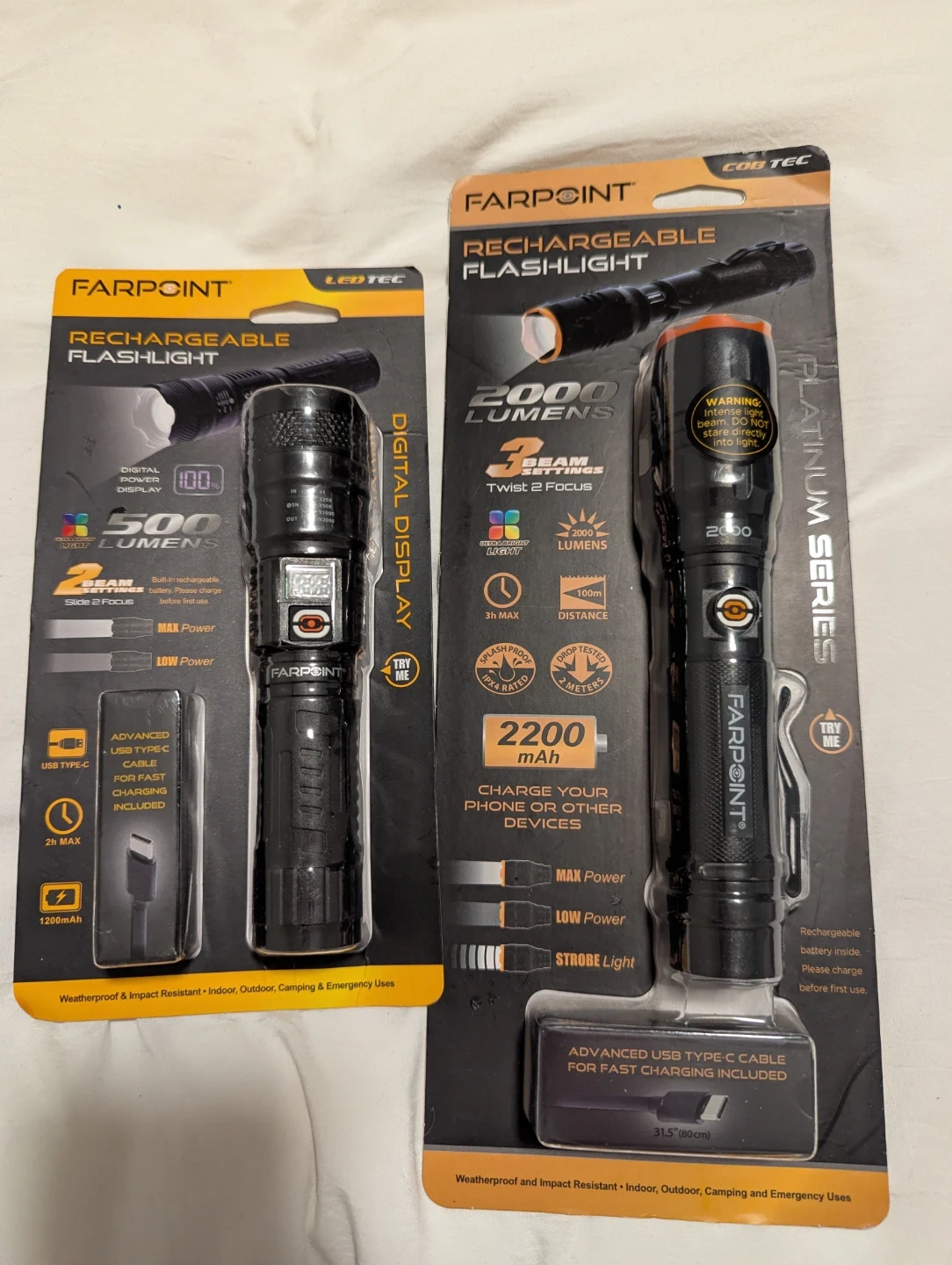 Selling 2 flashlights $40 for both, a wallet-$10 and a power Bank 10000 mAh for $15 with a lightening charging cord for $5