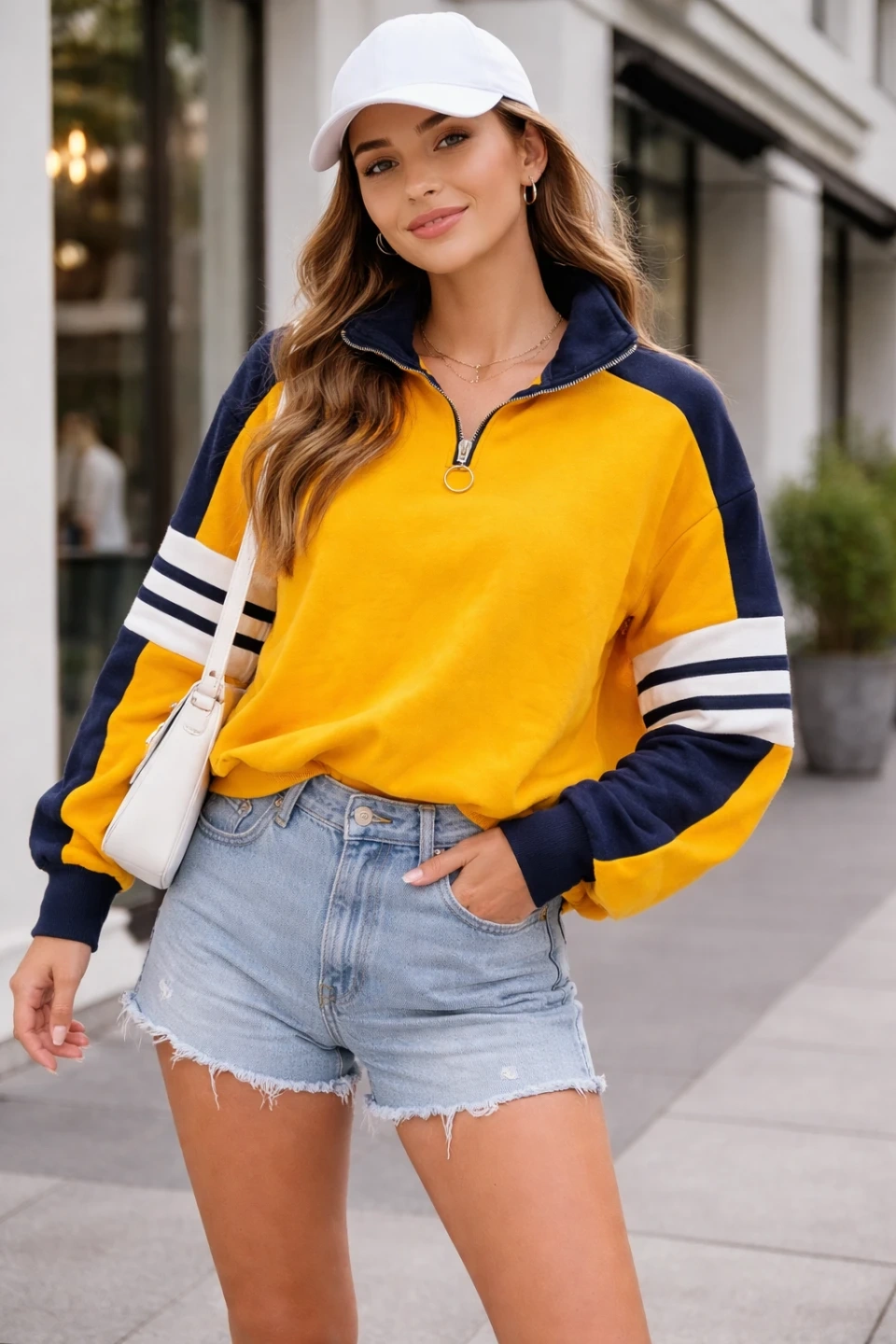 This comfy sweatshirt is yellow with navy blue sleeves and accents. It features a quarter-zip neckline and stripe details on the sleeves. A great casual piece for cooler weather!