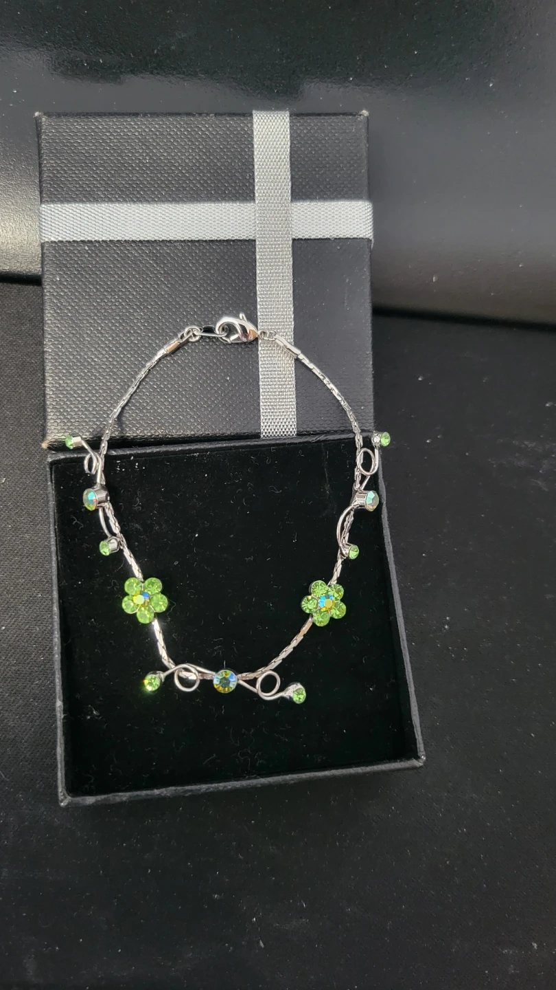 This silver-tone bracelet features delicate green floral and bead accents. It comes in a gift box, ready for gifting or personal wear. It's a pretty accessory for adding a touch of nature-inspired charm.