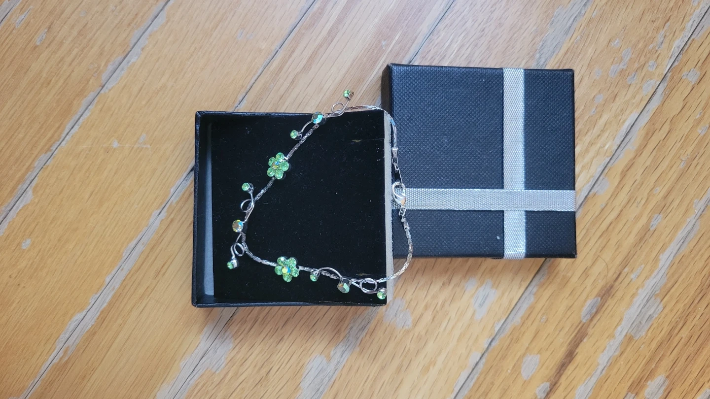 This silver-tone bracelet features delicate green floral and bead accents. It comes in a gift box, ready for gifting or personal wear. It's a pretty accessory for adding a touch of nature-inspired charm.