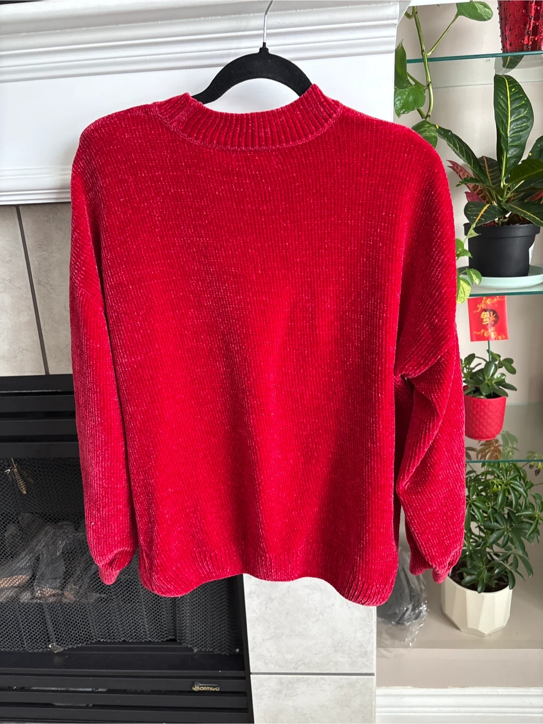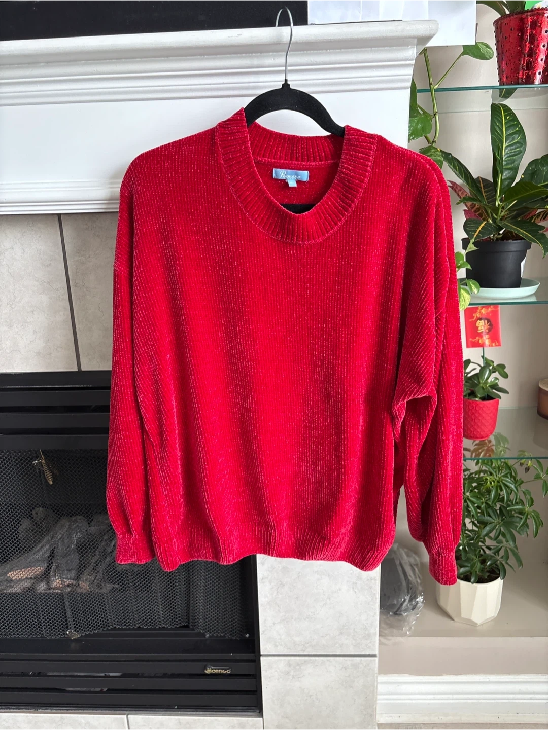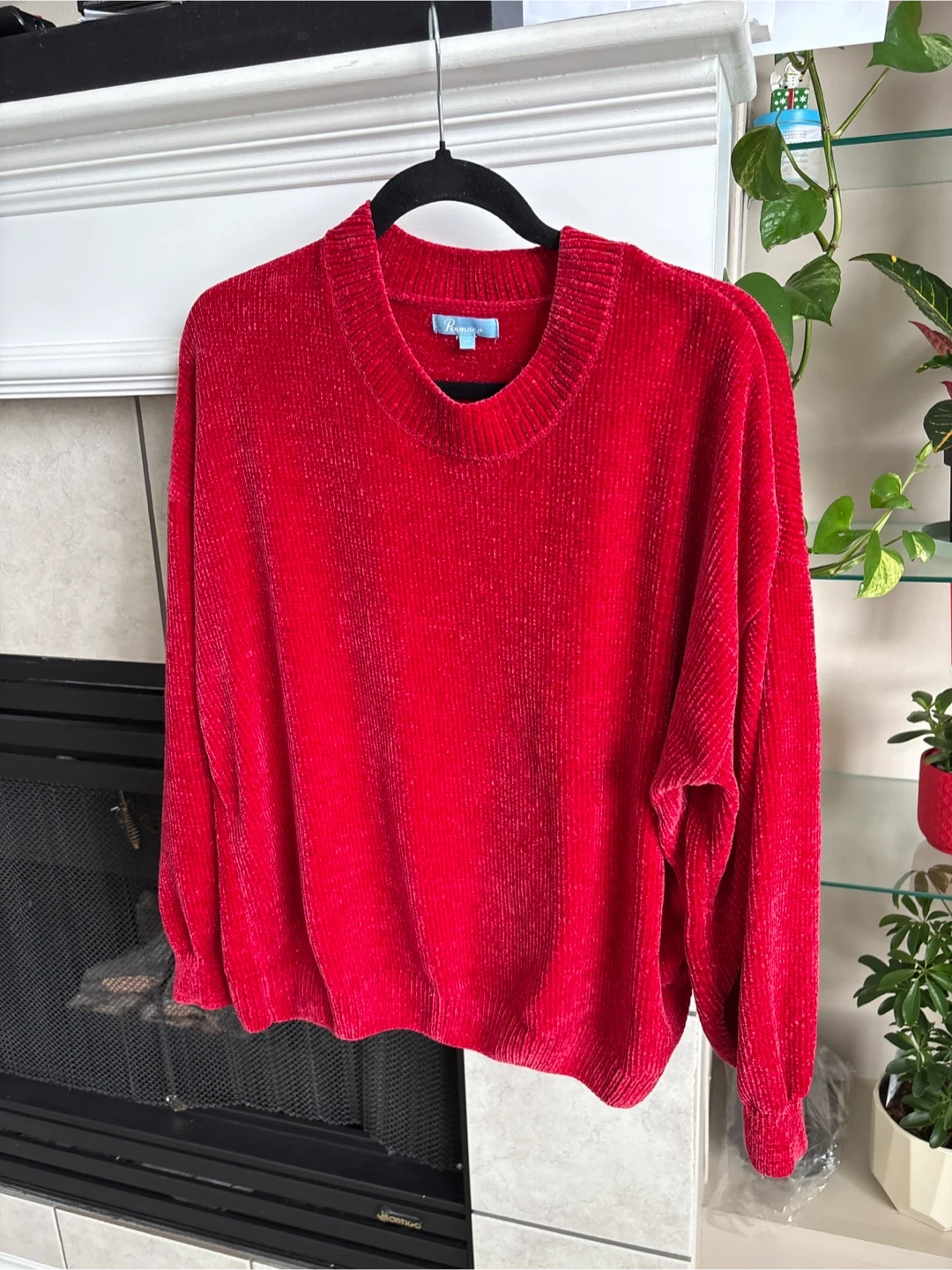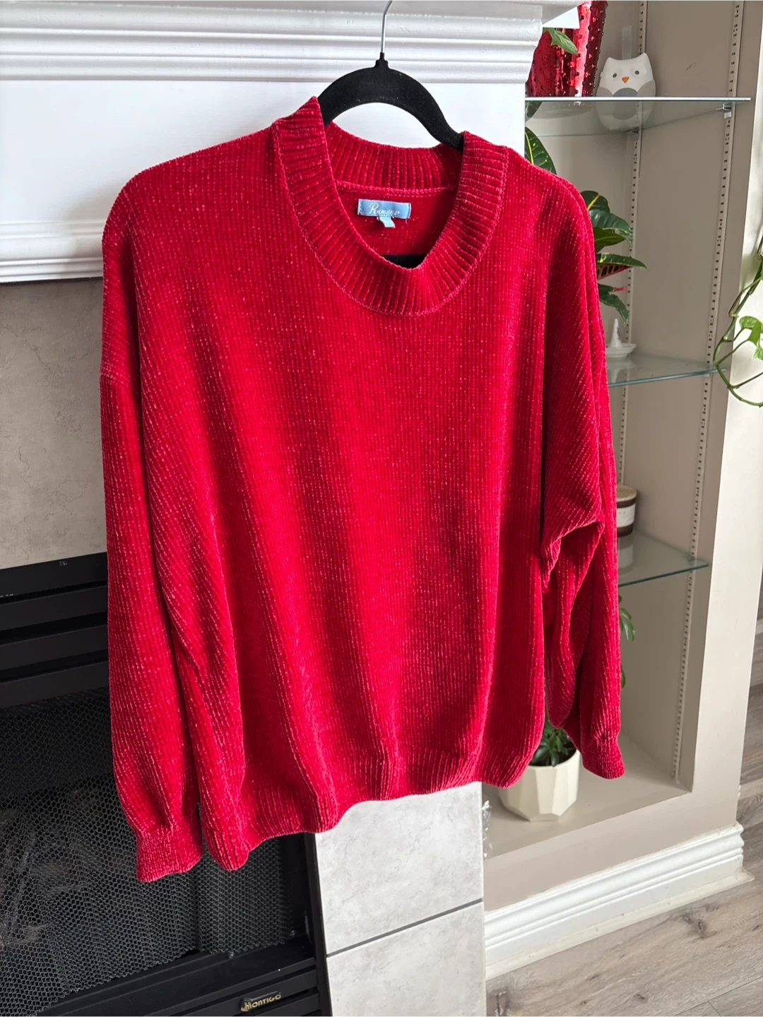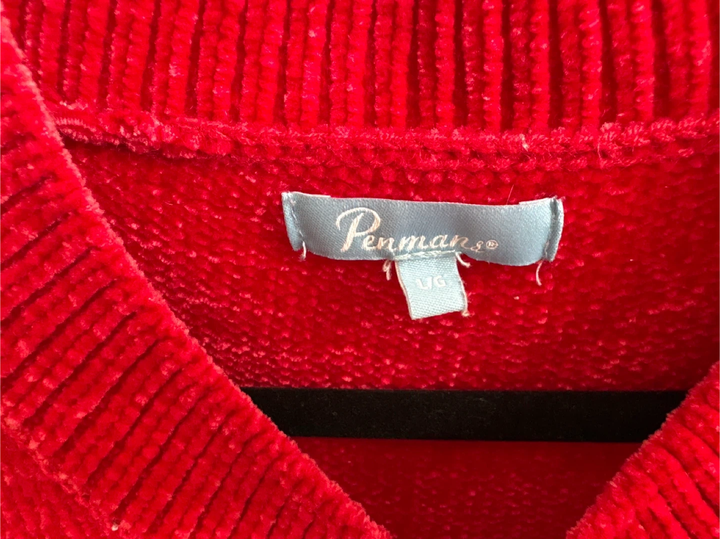 Cozy red velour sweater by Penman. Size large. It's got a comfortable, relaxed fit. Perfect for staying warm on chilly days!
