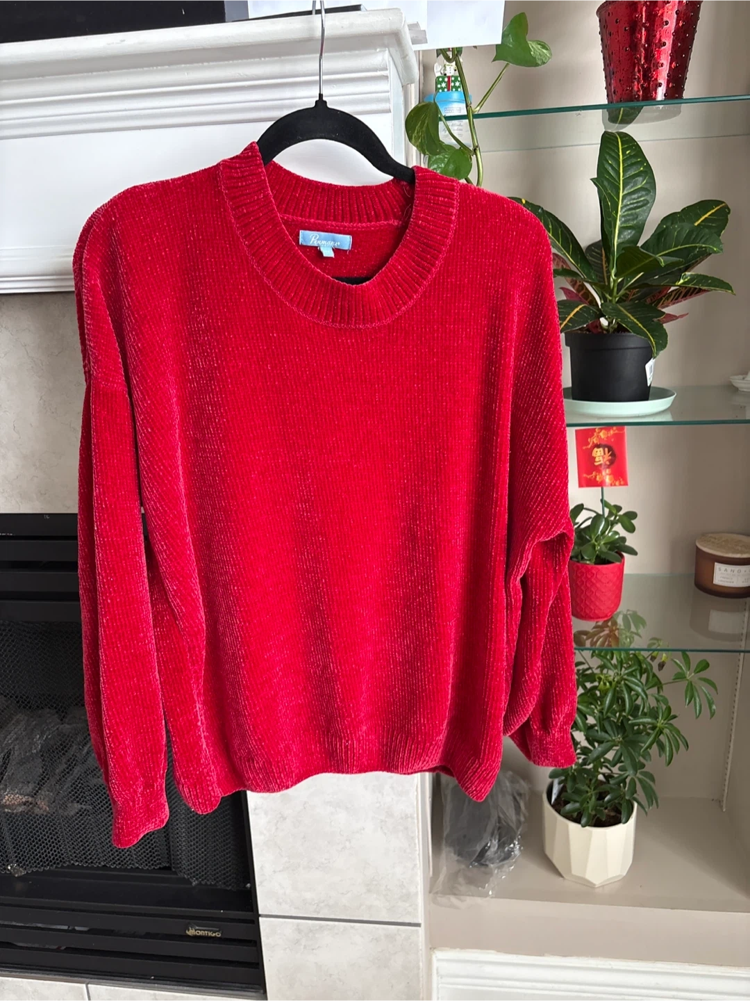 Cozy red velour sweater by Penman. Size large. It's got a comfortable, relaxed fit. Perfect for staying warm on chilly days!