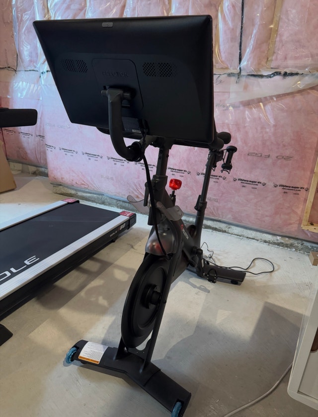 Includes: Peloton Bike, Peloton 3lb weights, Men's size 10 cycling shoes, Women's size 8 cycling shoes, and a bike mat.