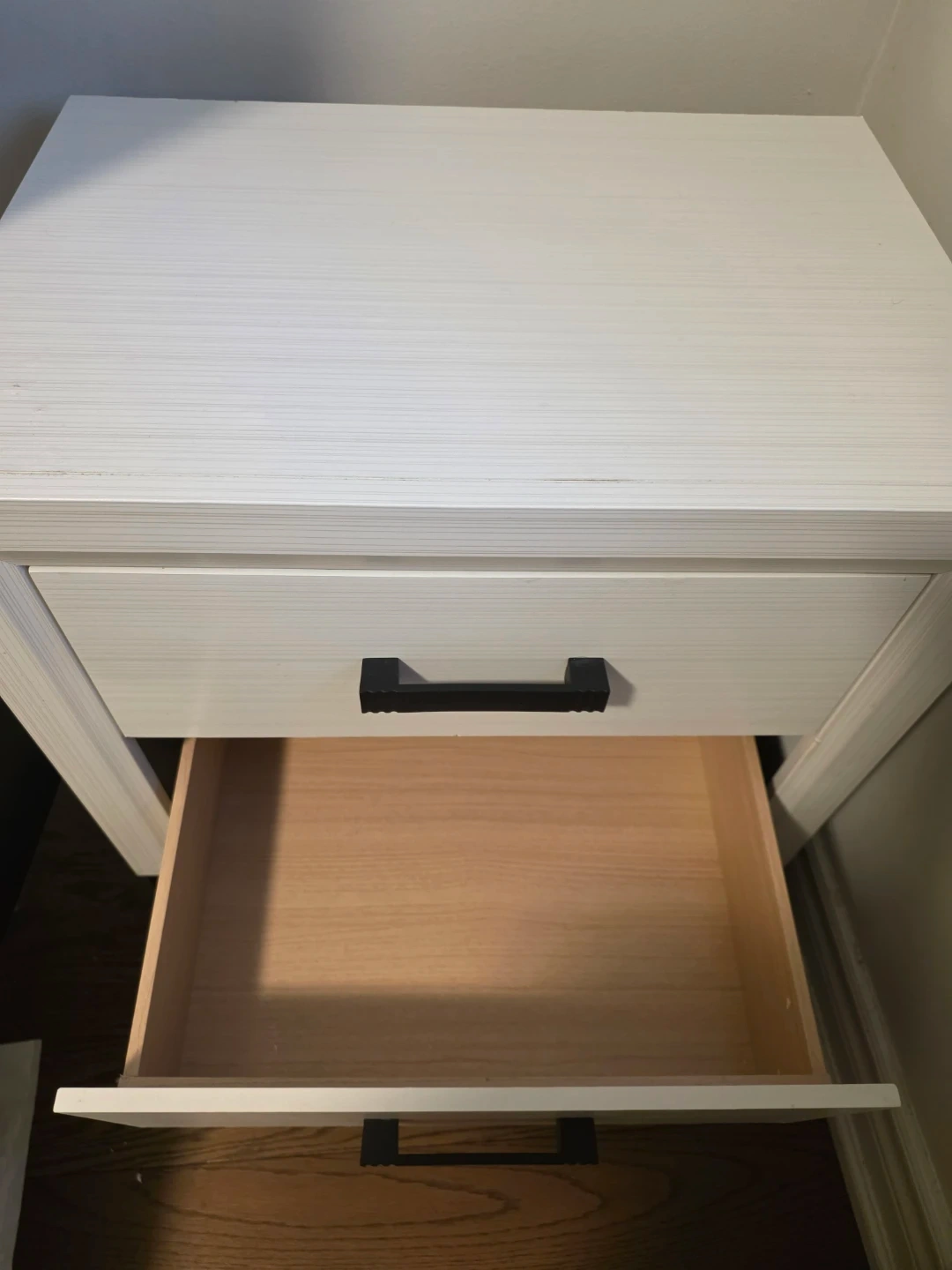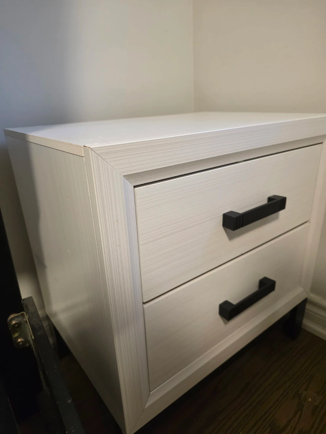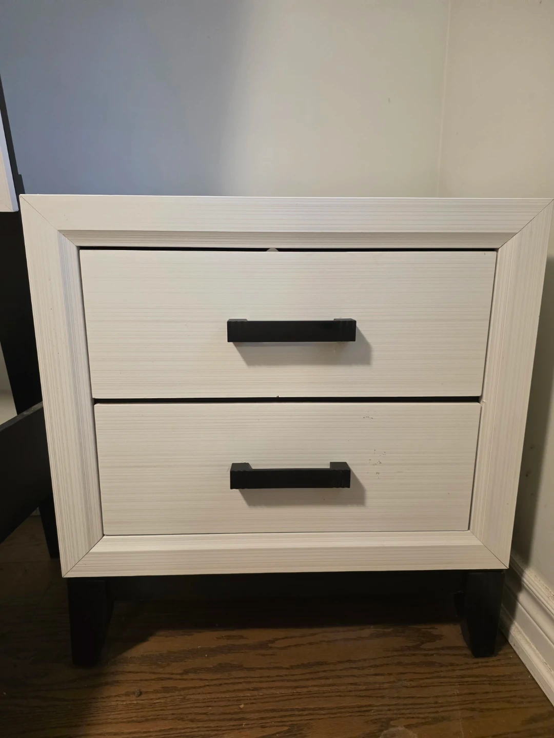 White nightstand with two drawers and black handles. Modern design with a textured finish. Perfect for keeping essentials handy by the bed!