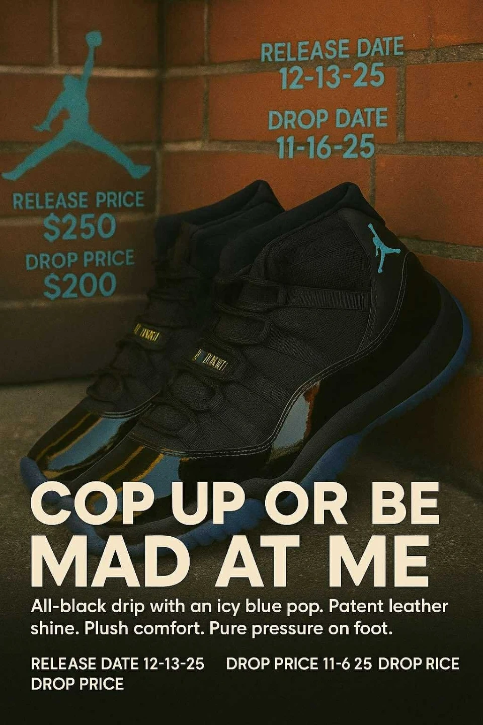 Selling a pair of Jordan 11 Retro Gamma sneakers in black. These shoes feature an all-black design with an icy blue pop, patent leather shine, and plush comfort. They provide pure pressure on your feet.
