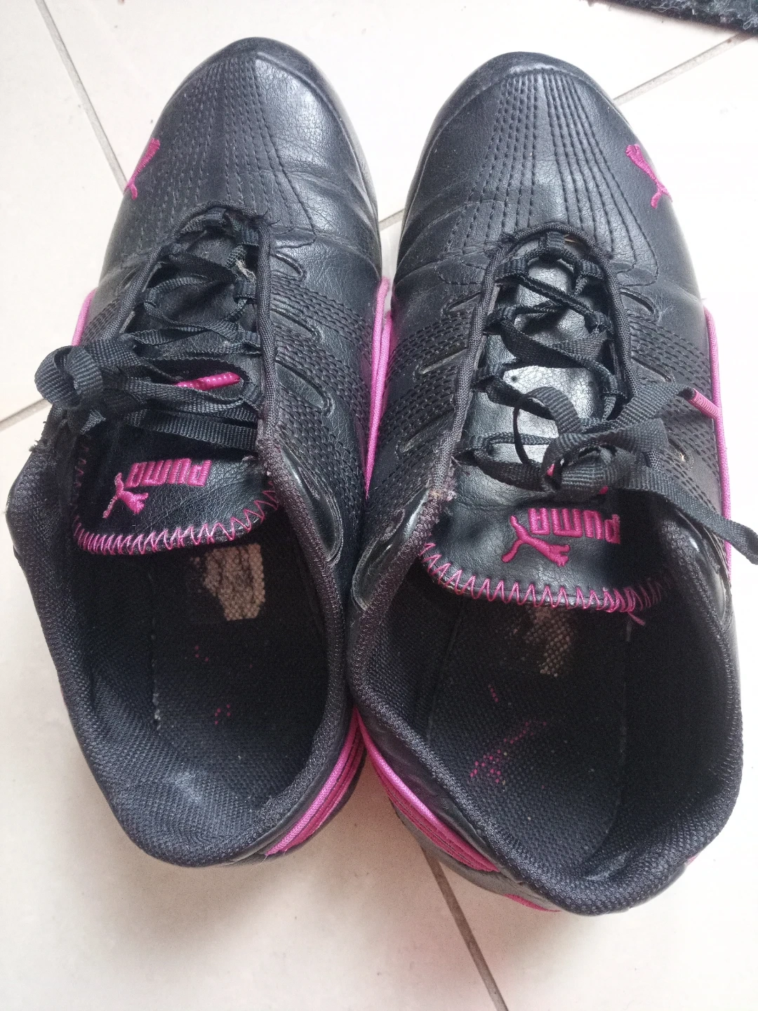 These are black Puma sneakers with pink accents. They're a women's size 8. The shoes are made of synthetic material. They're ready for casual wear!