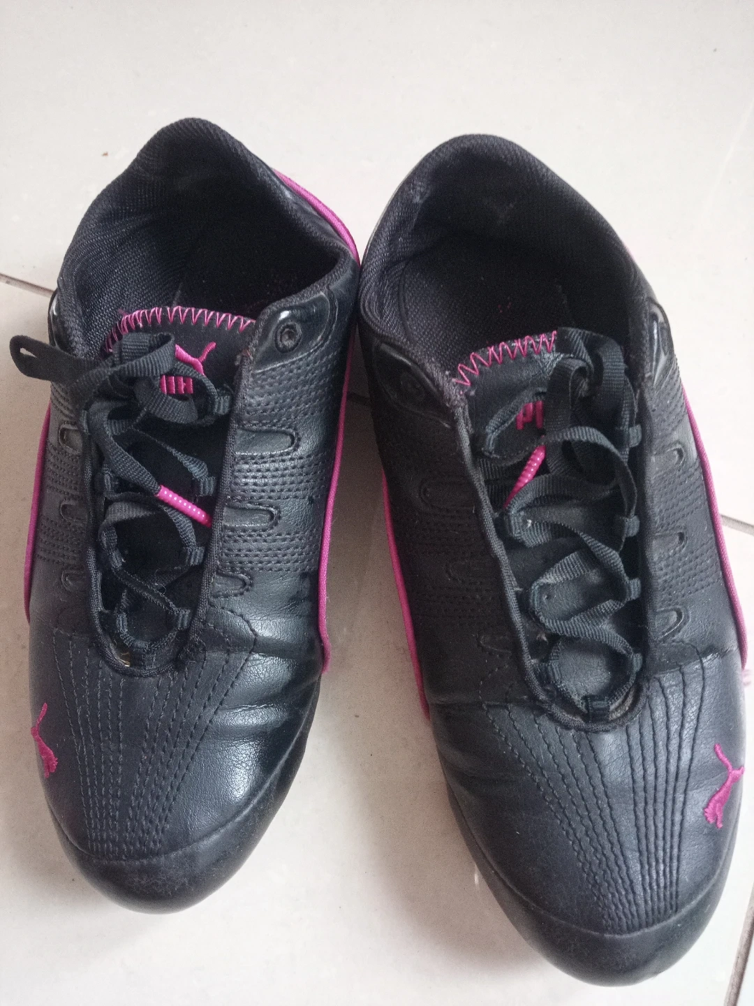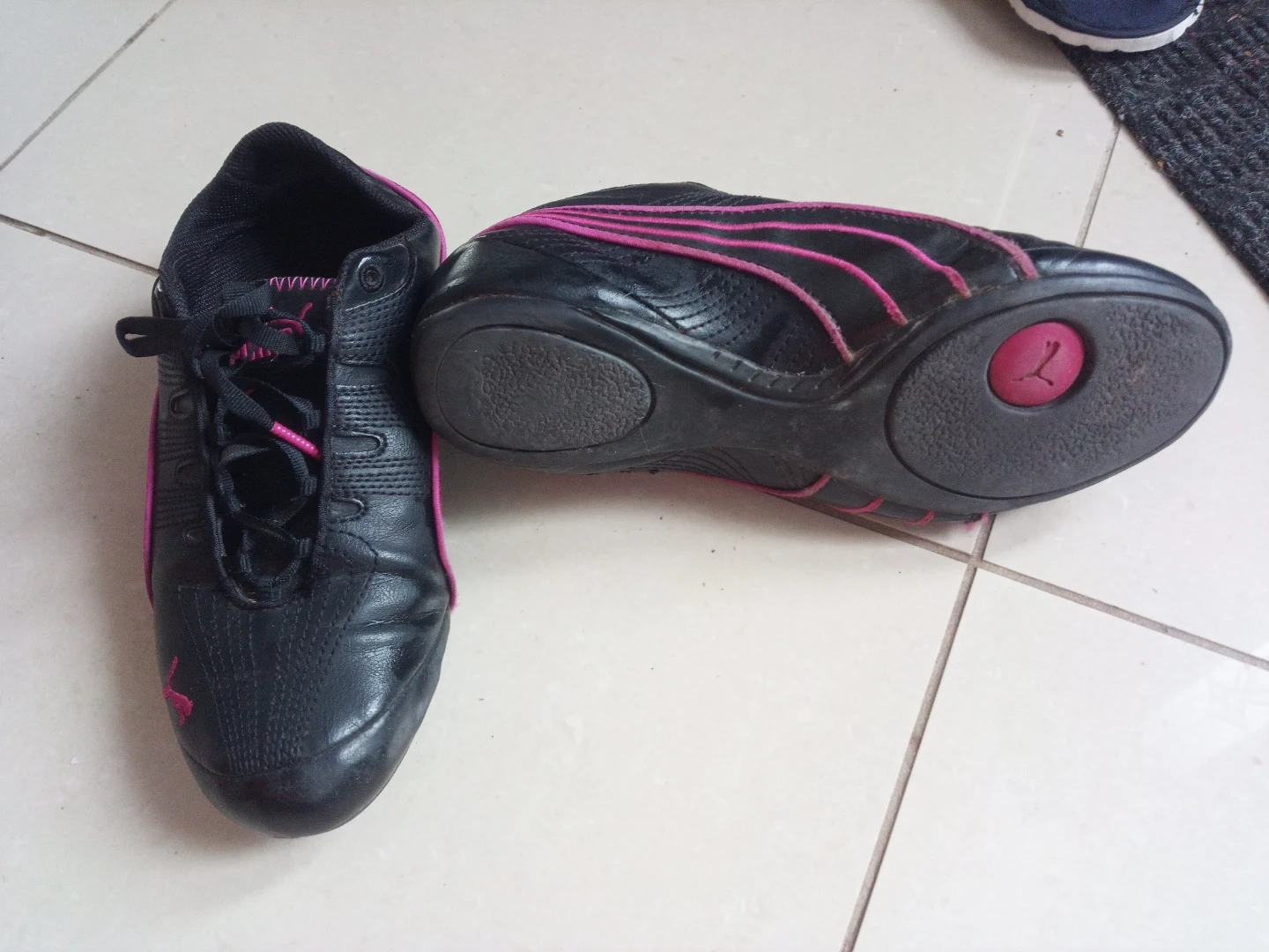 These are black Puma sneakers with pink accents. They're a women's size 8. The shoes are made of synthetic material. They're ready for casual wear!