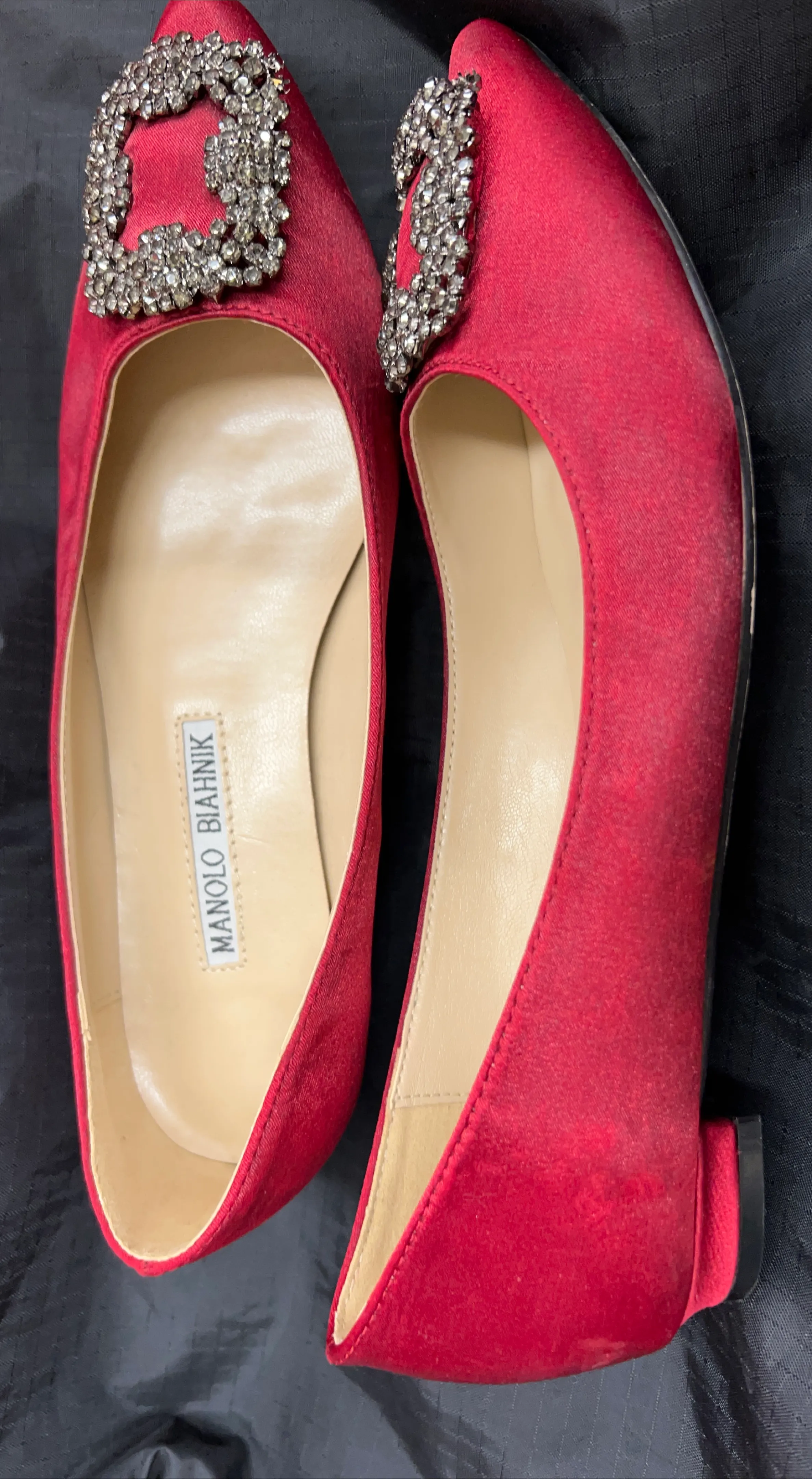 Selling a pair of Manolo Blahnik Hangisiflat red satin flat pumps featuring an iconic square crystal-embellished buckle. The design was inspired by adornments seen on 17th-century royals and the paintings of Boldini.
