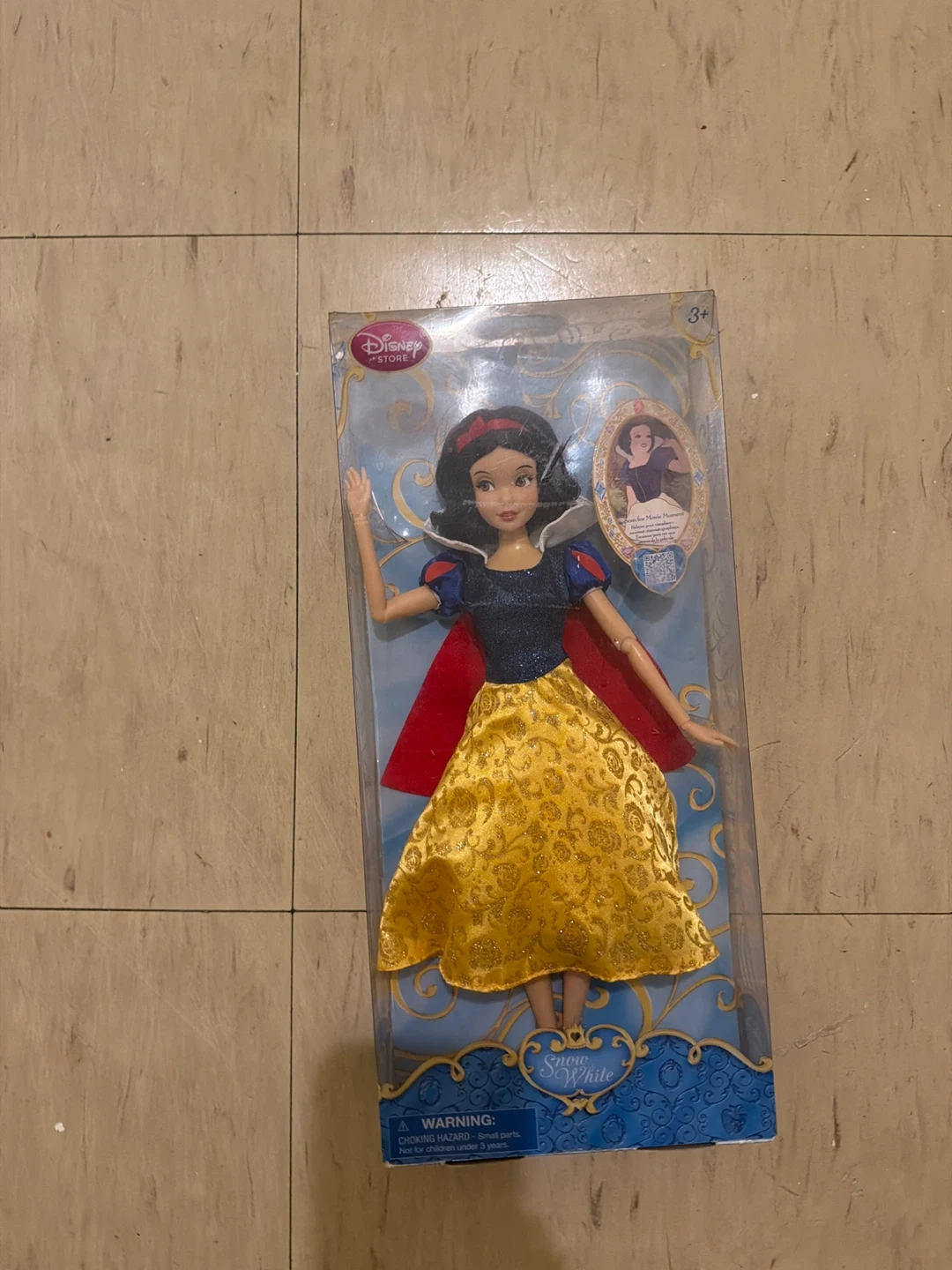 This is a Disney Store Snow White doll in its original packaging. It features her classic blue bodice, yellow sparkly skirt, and red cape. Suitable for ages 3 and up.