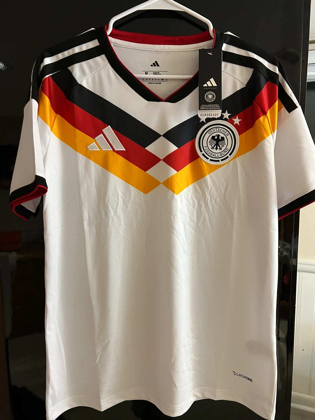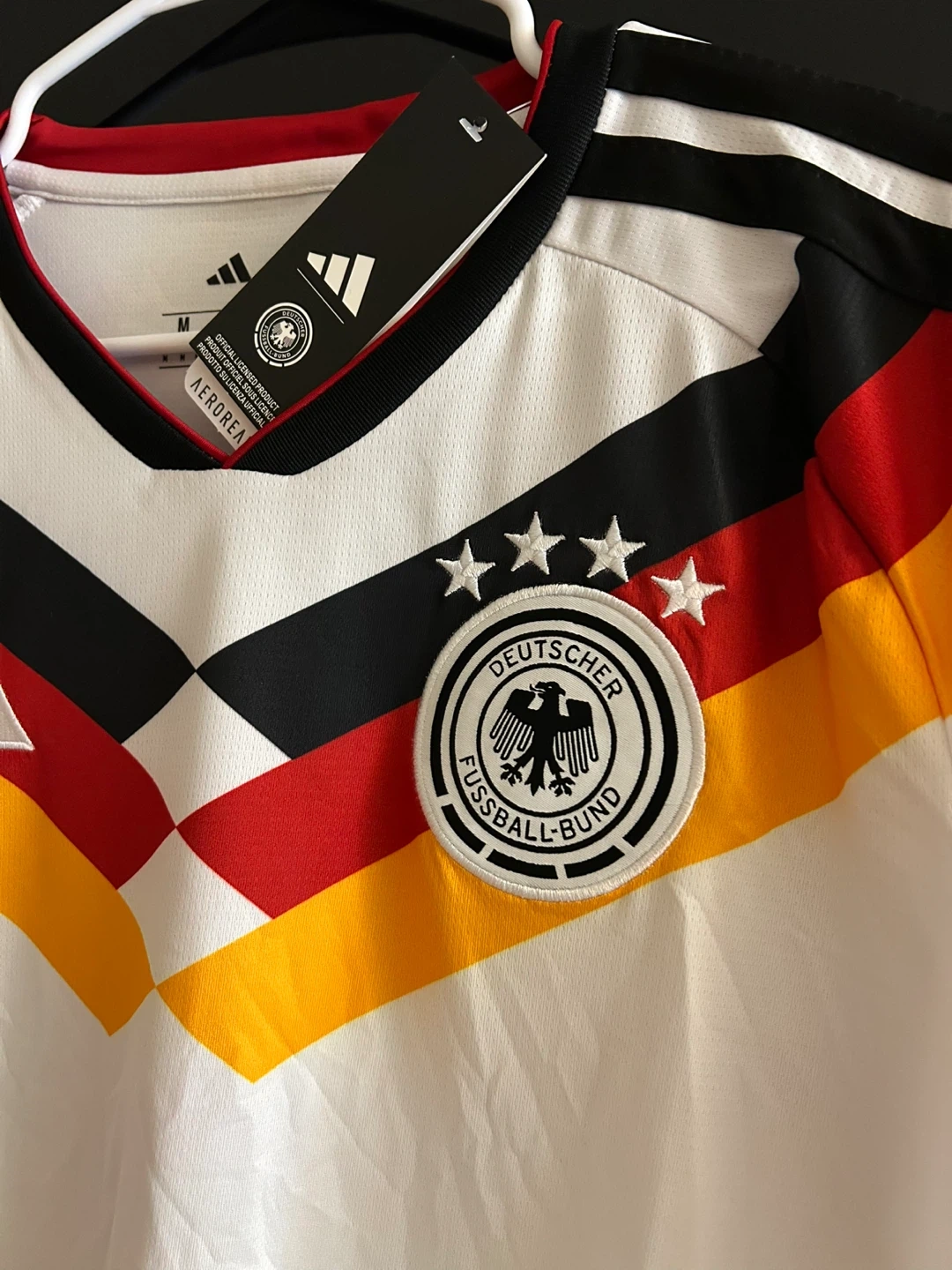 This is an Adidas Germany national football team jersey. The jersey is made with Aeroready and Climalite technology.