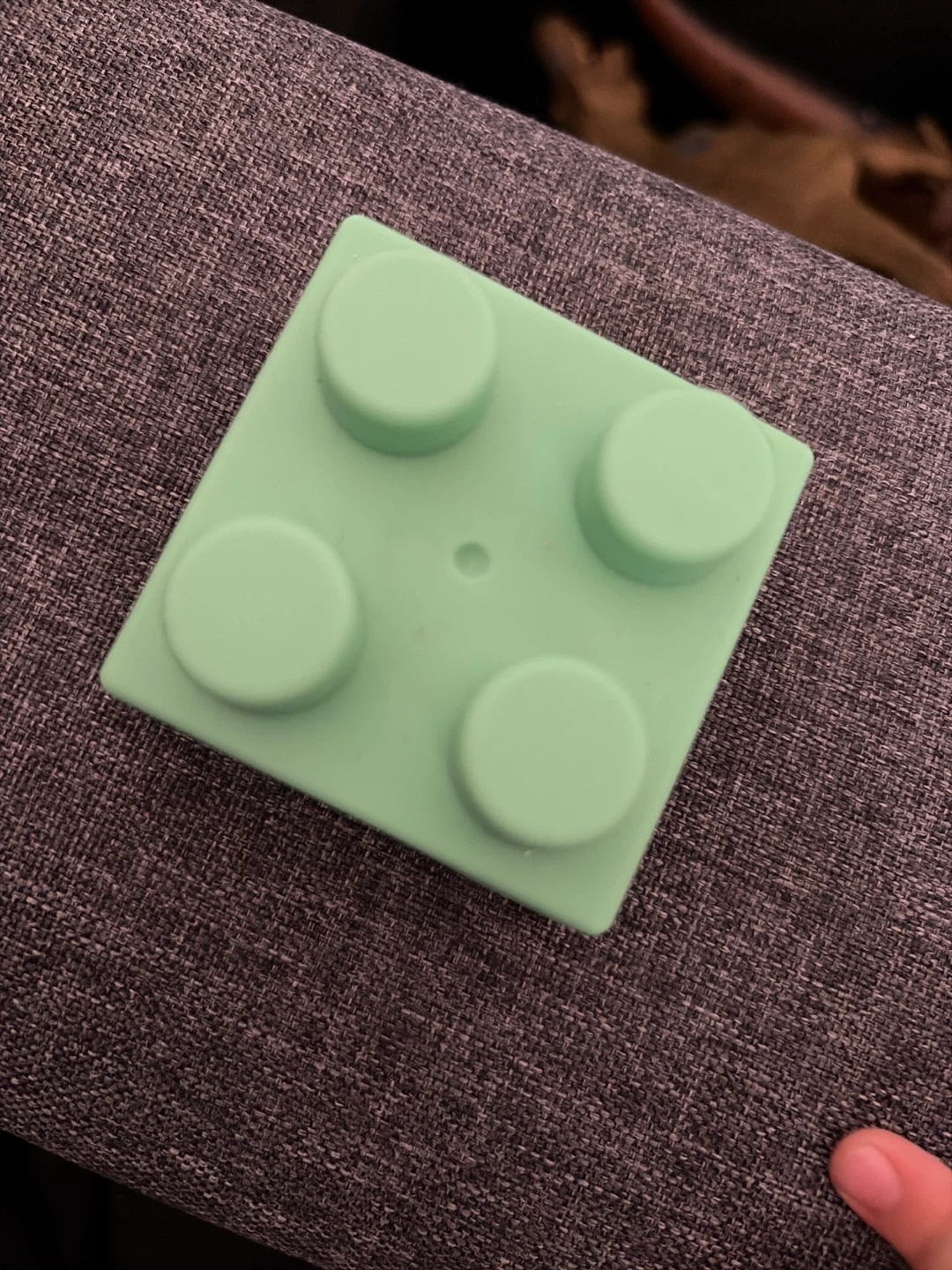 This is a green silicone building block toy. It's a 2x2 stud design. Made from food-grade silicone, it's safe for little ones!