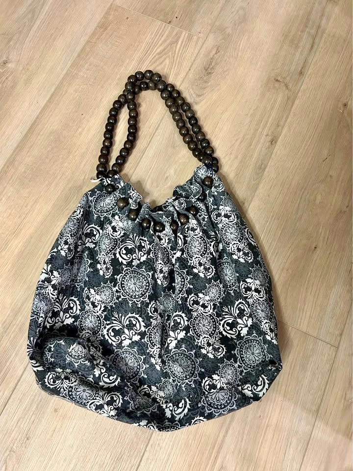 Here's a stylish tote bag featuring a unique pattern and wooden handles! It's perfect for carrying your everyday essentials in style. The bag is in great condition and ready for a new home. Remote control is for size reference.