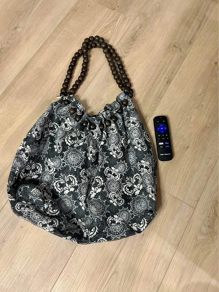 Here's a stylish tote bag featuring a unique pattern and wooden handles! It's perfect for carrying your everyday essentials in style. The bag is in great condition and ready for a new home. Remote control is for size reference.