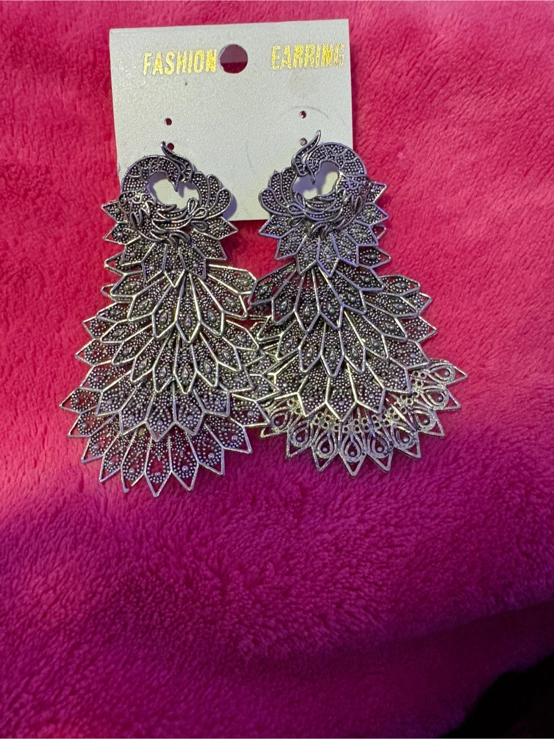 Selling a pair of fashion earrings in silver. They have a unique peacock design and a leaf-like pattern. Perfect for adding a touch of elegance to any outfit!