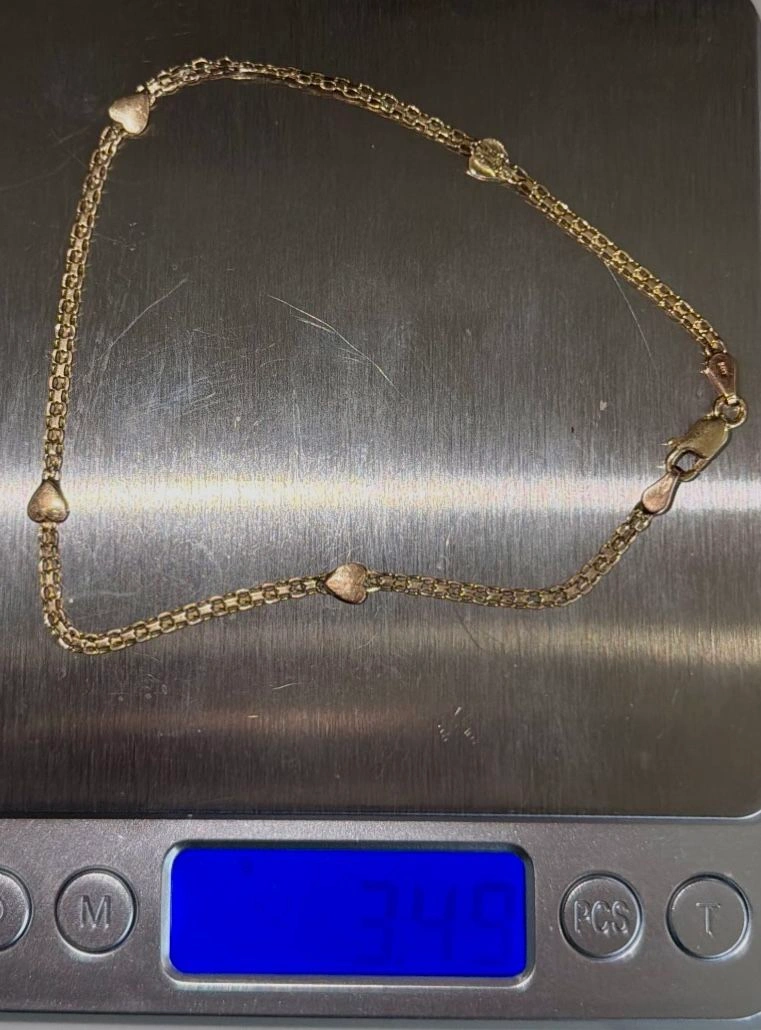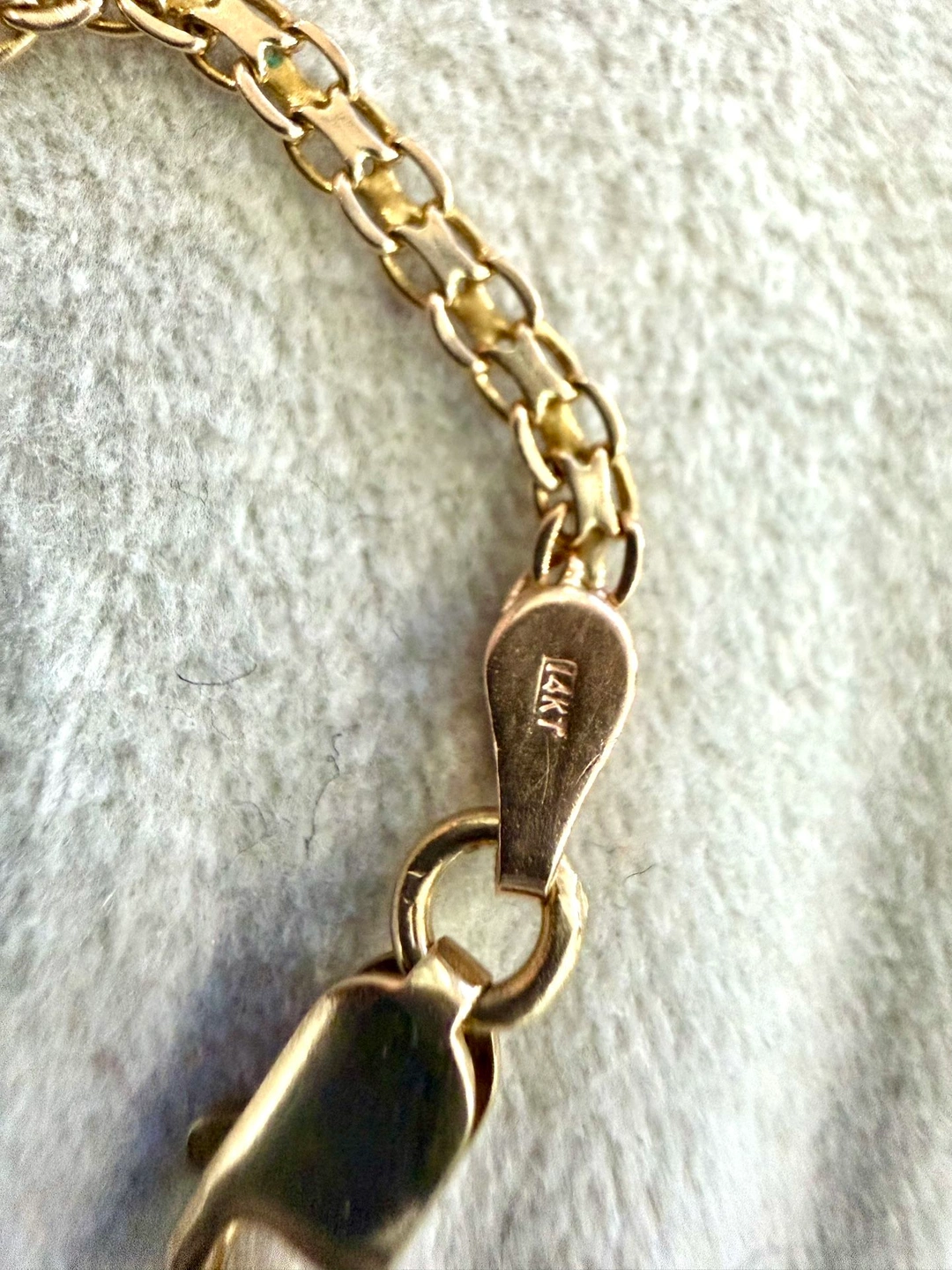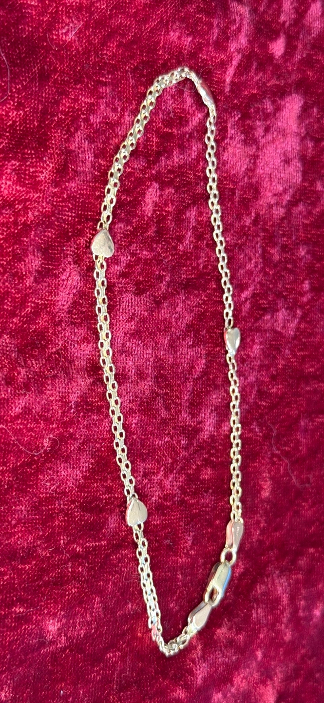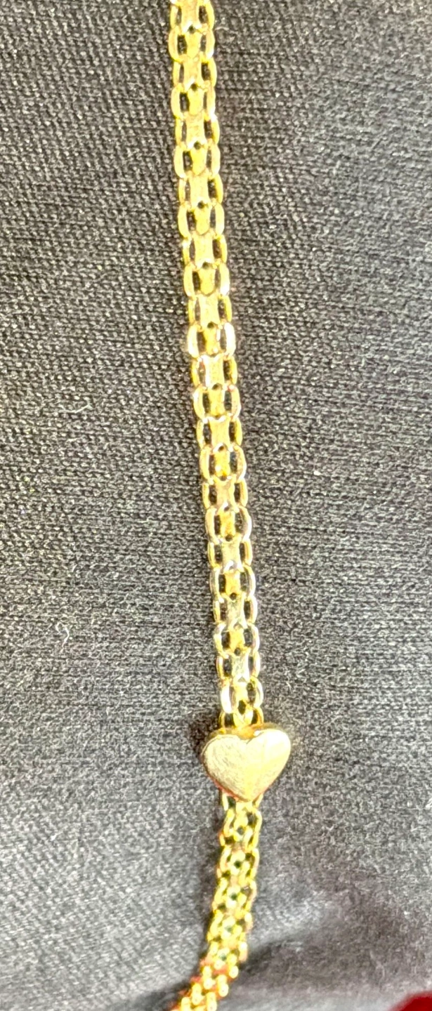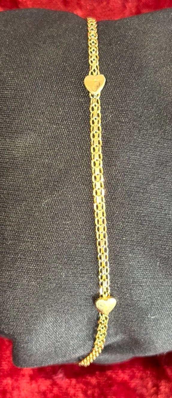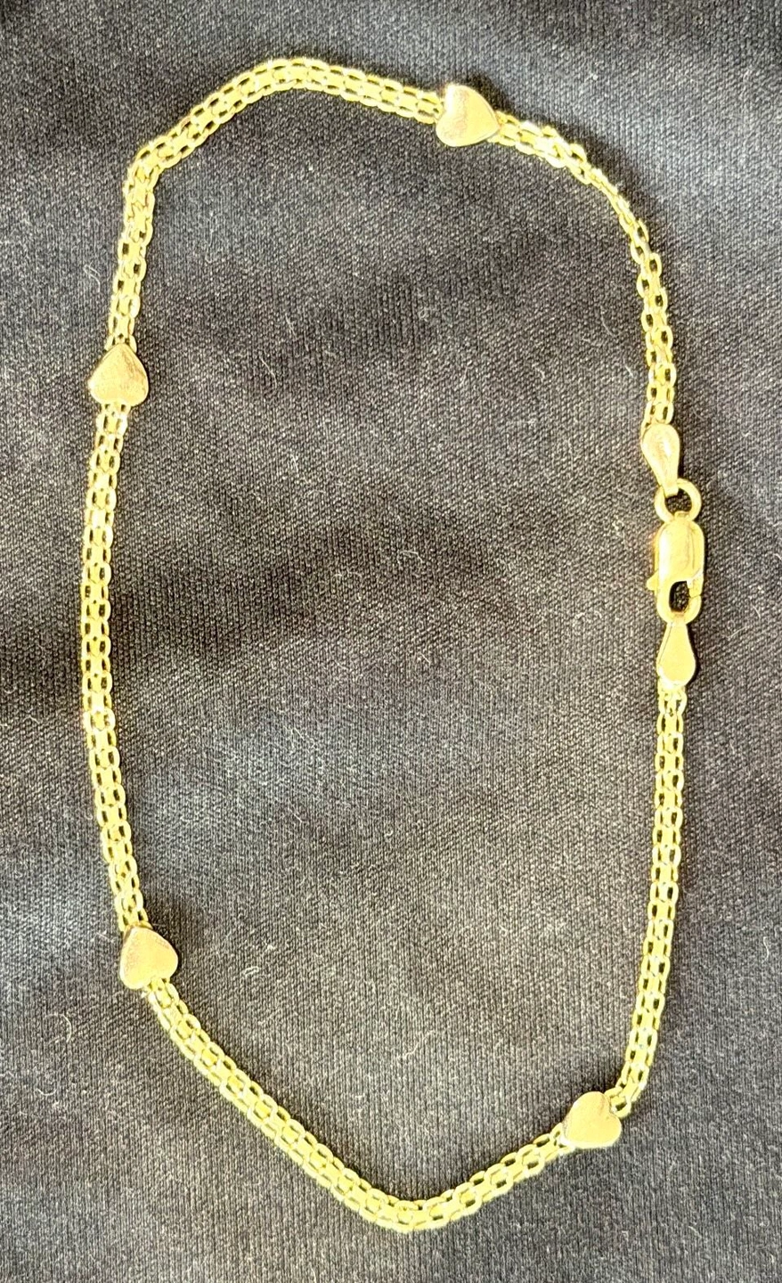 14K yellow gold ankle bracelet, 10" long. Features 4 heart-shaped charms integrated into the chain. Diamond-cut links add sparkle. Strong bracelet with a lobster claw clasp closure. Stamped 14K Italy. Weighs 3.49 grams of solid gold. All my items are real gold and genuine gemstones. Prices are firm. Cash only sale. Transactions conducted at Glenview Police Department or Morton Grove PD. Please check out my other listings. Thank you!