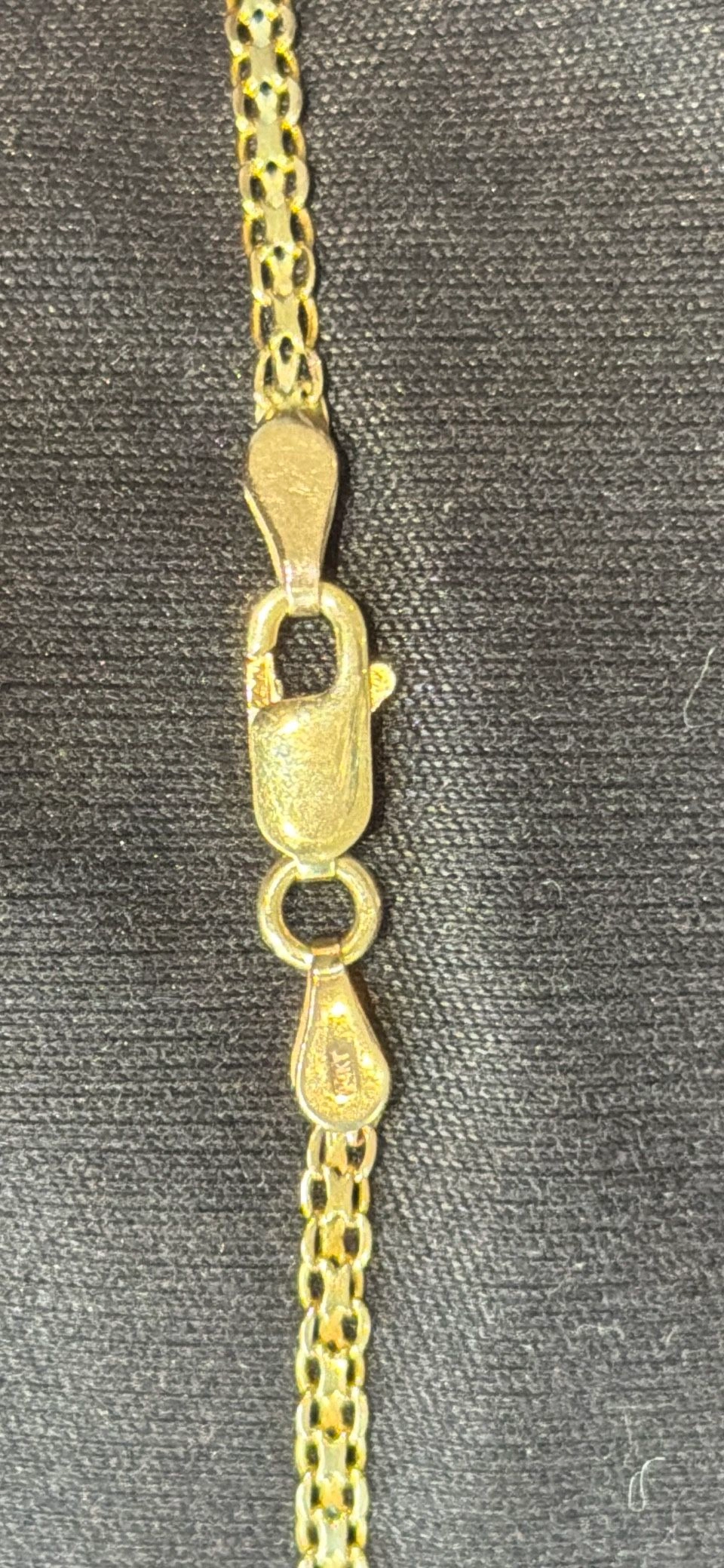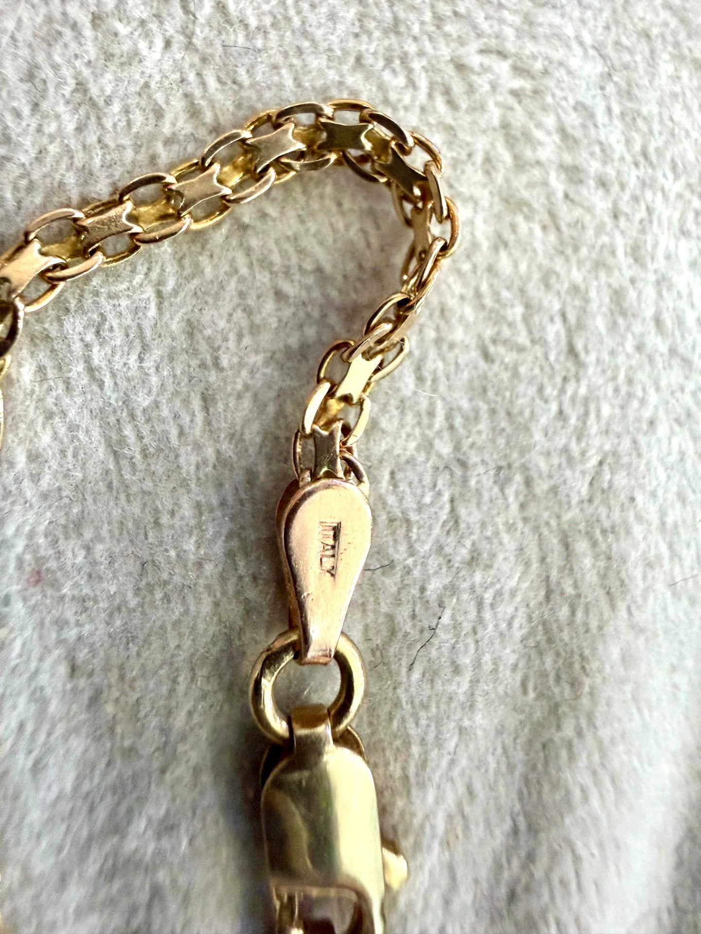 14K yellow gold ankle bracelet, 10" long. Features 4 heart-shaped charms integrated into the chain. Diamond-cut links add sparkle. Strong bracelet with a lobster claw clasp closure. Stamped 14K Italy. Weighs 3.49 grams of solid gold. All my items are real gold and genuine gemstones. Prices are firm. Cash only sale. Transactions conducted at Glenview Police Department or Morton Grove PD. Please check out my other listings. Thank you!