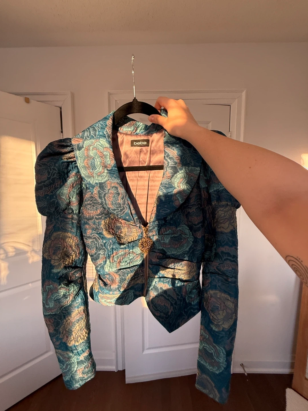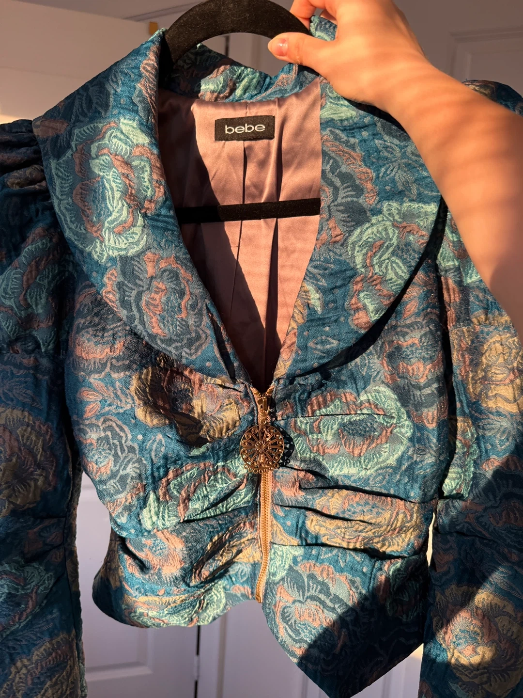 One of a kind gorgeous teal brocade jacket from Bebe. Bought it in a vintage store in Paris 🇫🇷🫶🏼