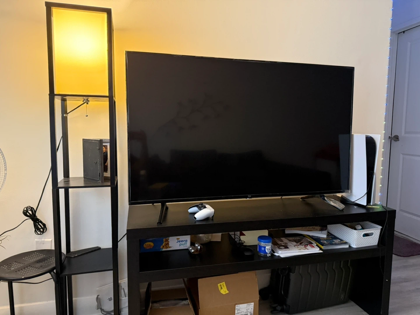 Selling a complete living room setup in excellent / like-new condition. Includes a 55-inch Amazon Fire TV, an IKEA TV table, and a modern floor lamp. The TV is in brand new condition, rarely used and works perfectly. Perfect setup for a living room, bedroom, or apartment.