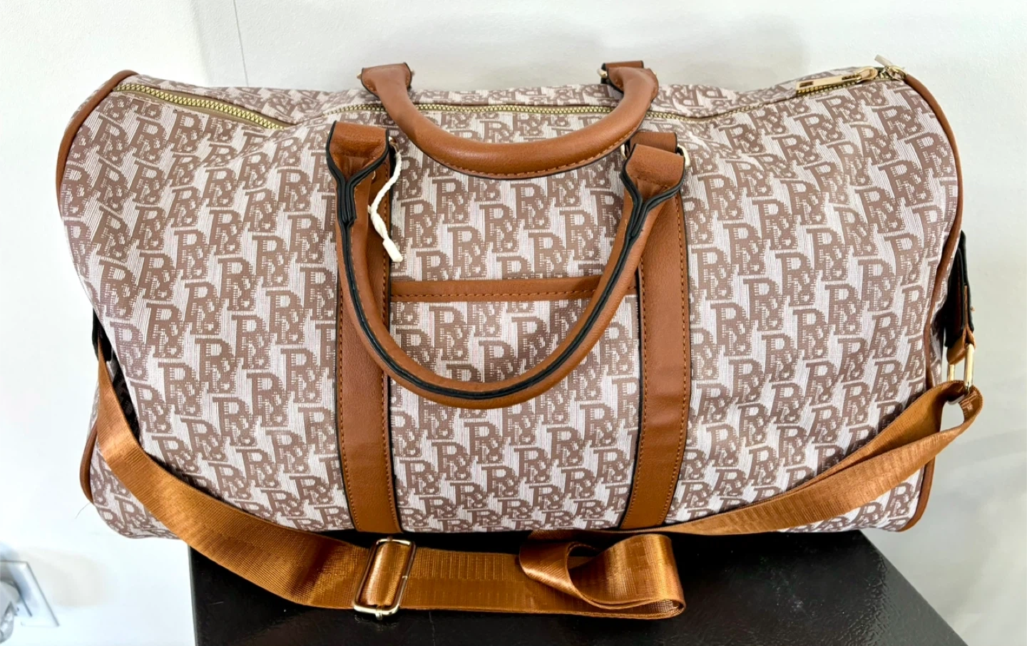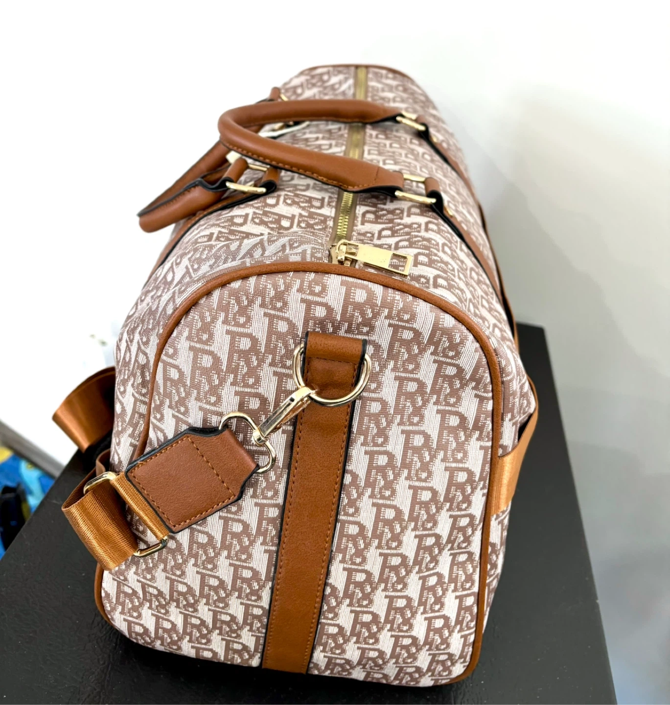 🔥This stylish weekender duffel bag features a repeating monogram pattern. It includes dual top handles and a detachable shoulder strap for versatile carrying. Brown trim and gold-tone hardware complete the look.