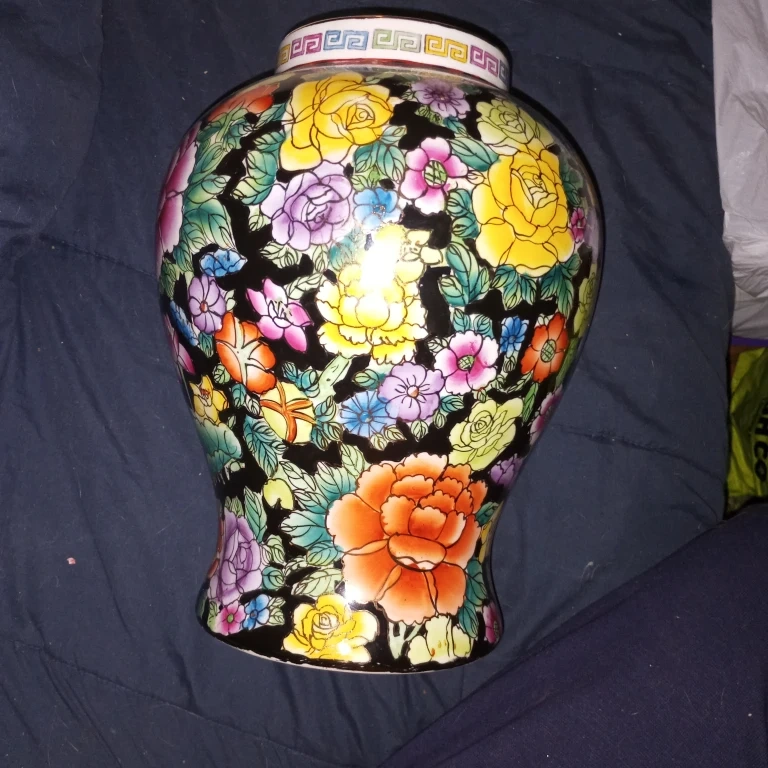 This is a large ceramic vase featuring a colourful floral pattern on a black background.
