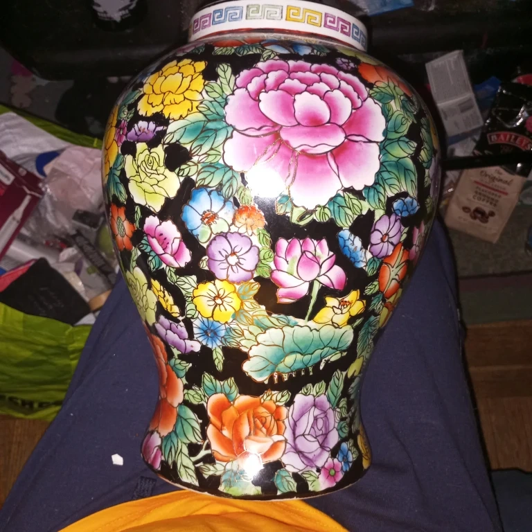 This is a large ceramic vase featuring a colourful floral pattern on a black background.